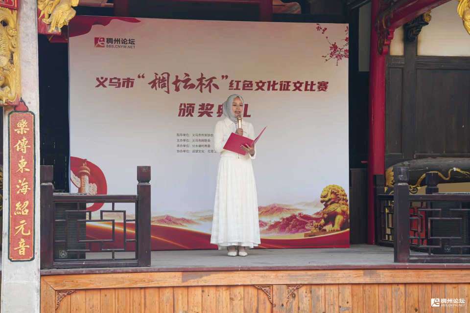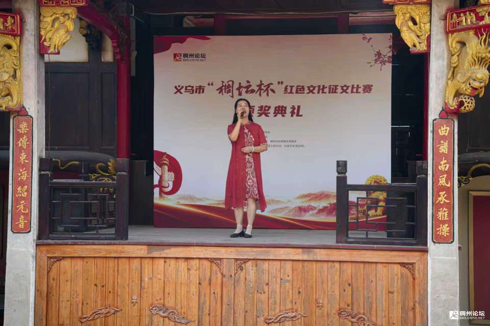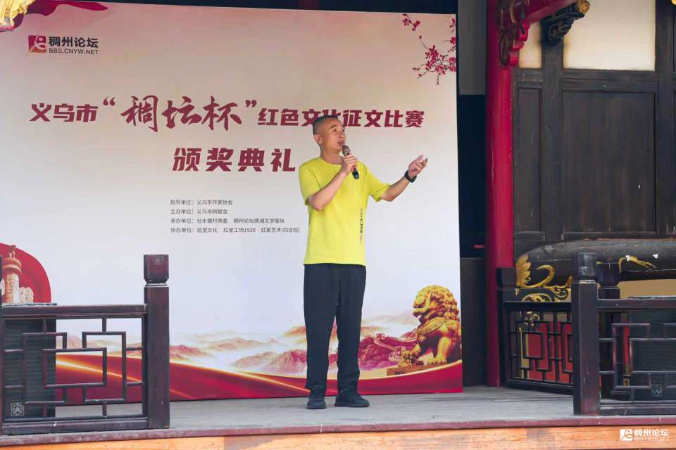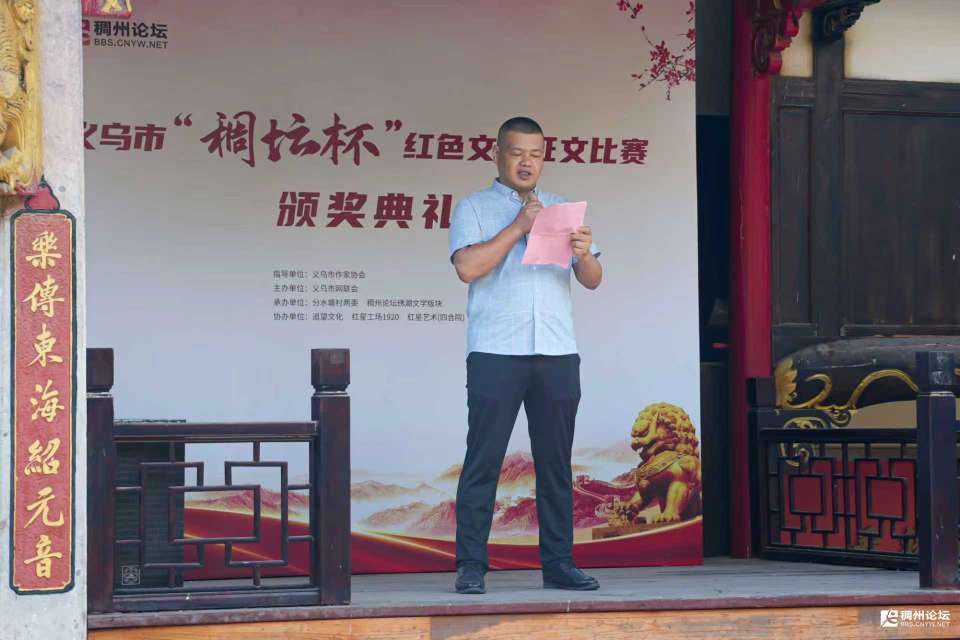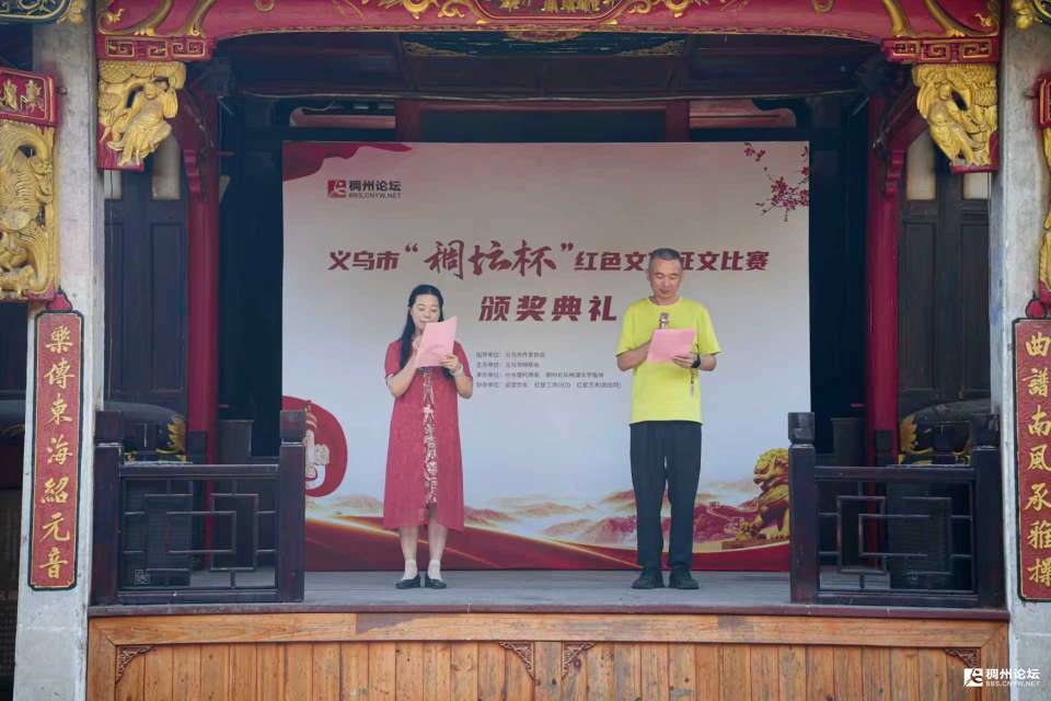主持人乙:在此,我们要特别鸣谢指导单位义乌市作家协会,主办单位义乌市网联会,承办单位分水塘村两委、稠州论坛绣湖文学版块,以及协办单位追望文化、红星工场1920、红星艺术(四合院),正是因为大家的共同努力,才让本次活动得以顺利开展。