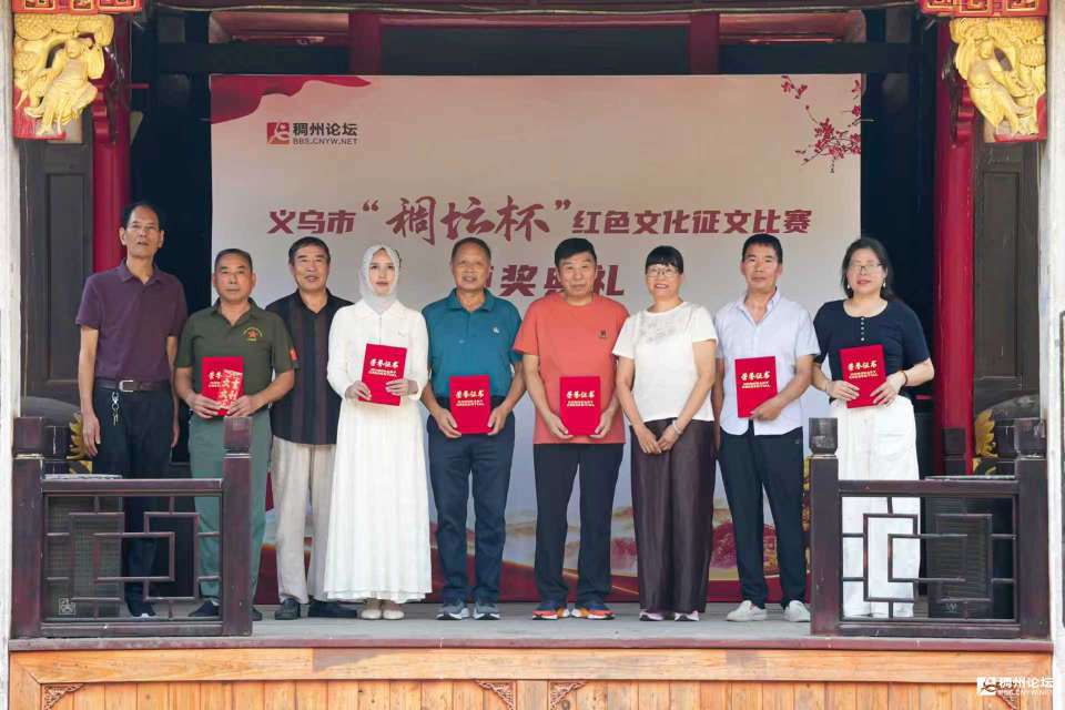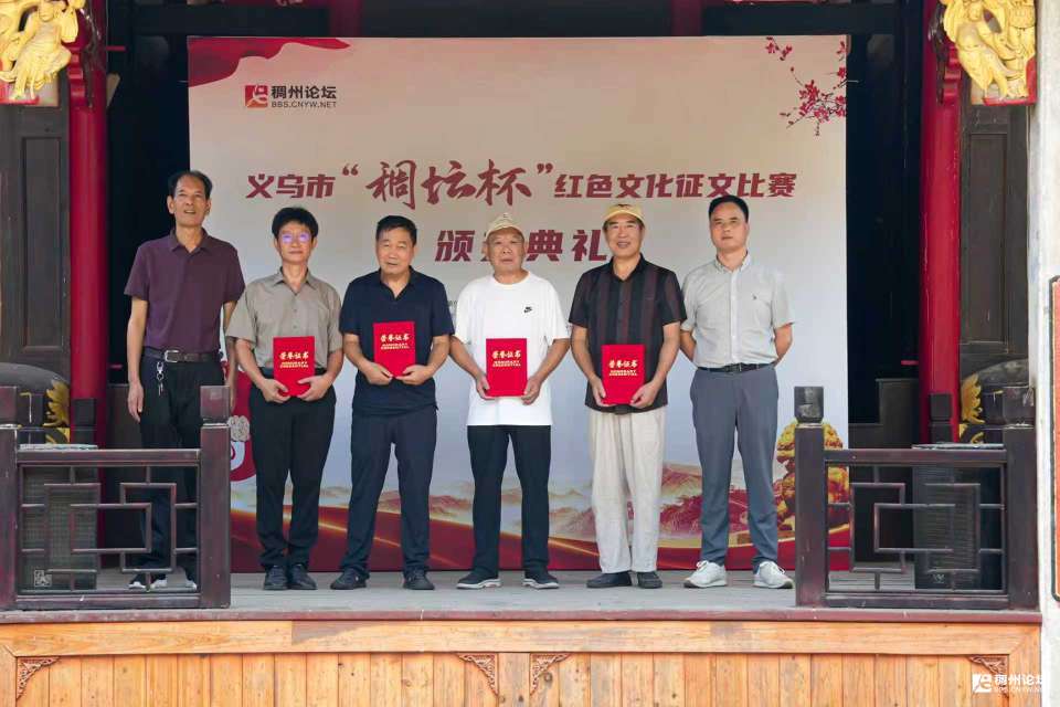 主持人乙:感谢詹会长的精彩演唱,让我们仿佛看到了红梅傲雪绽放的英姿。在本次征文比赛中,还有一些作品,以其深刻的思想、动人的故事,为红色文化的传承做出了特殊贡献。现在,有请特殊贡献奖获得者:王选、王春平、王升祥、吴宗耀、胡友大、赵四海、徐庆丰、潘升华、方向明、王和清、何吴生、骆正法、喻景泉上台领奖。有请义乌市网联会会长季顺杰先生,金华作协会员、稠州论坛绣湖文学版主成江银老师上台为他们颁奖。让我们再次用热烈的掌声,向他们表示崇高的敬意,请摄影师为他们记录这荣耀的一刻。