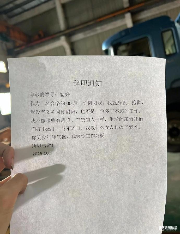 刷到网上传的00后辞职信,要么写着“看不惯领导画饼,辞职!”,要么是 “不想加班,世界那么大我想去看看”,评论里都在说 00 后 “职场反骨”“说走就走”。