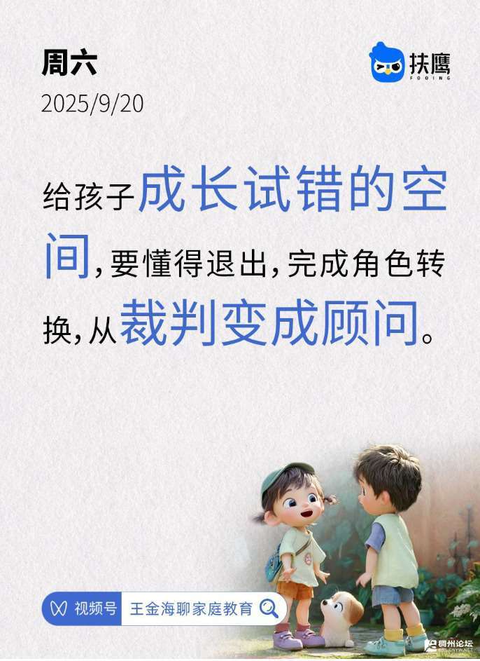 今日家庭教育日签:“给孩子成长试错的空间,要懂得退出。完成角色转换,从裁判变成顾问。”