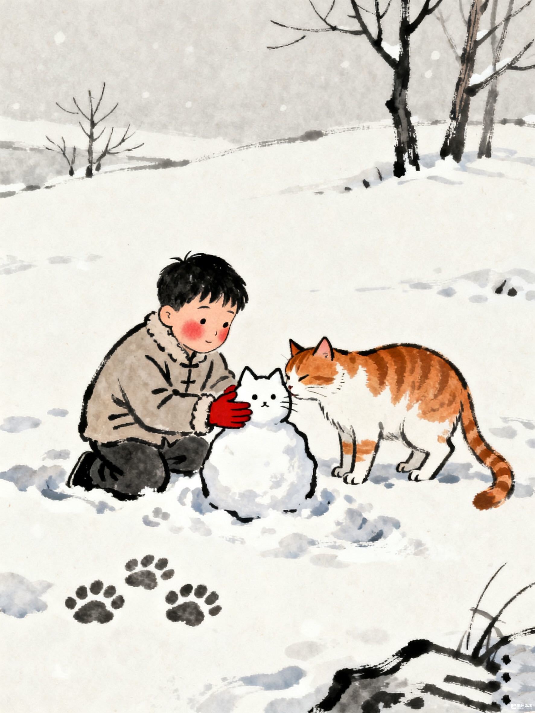 雪簌簌落着,把世界裹成温柔的白 男孩冻得发红的手,正小心抚着小雪猫的“脑袋”,旁边橘白相间的真猫,亲昵地蹭了蹭雪猫的脸,像在和自己的“雪分身”打招呼。雪地上,猫爪印和孩子的脚印叠在一起,虚的雪猫、实的真猫,都暖得像团小太阳。