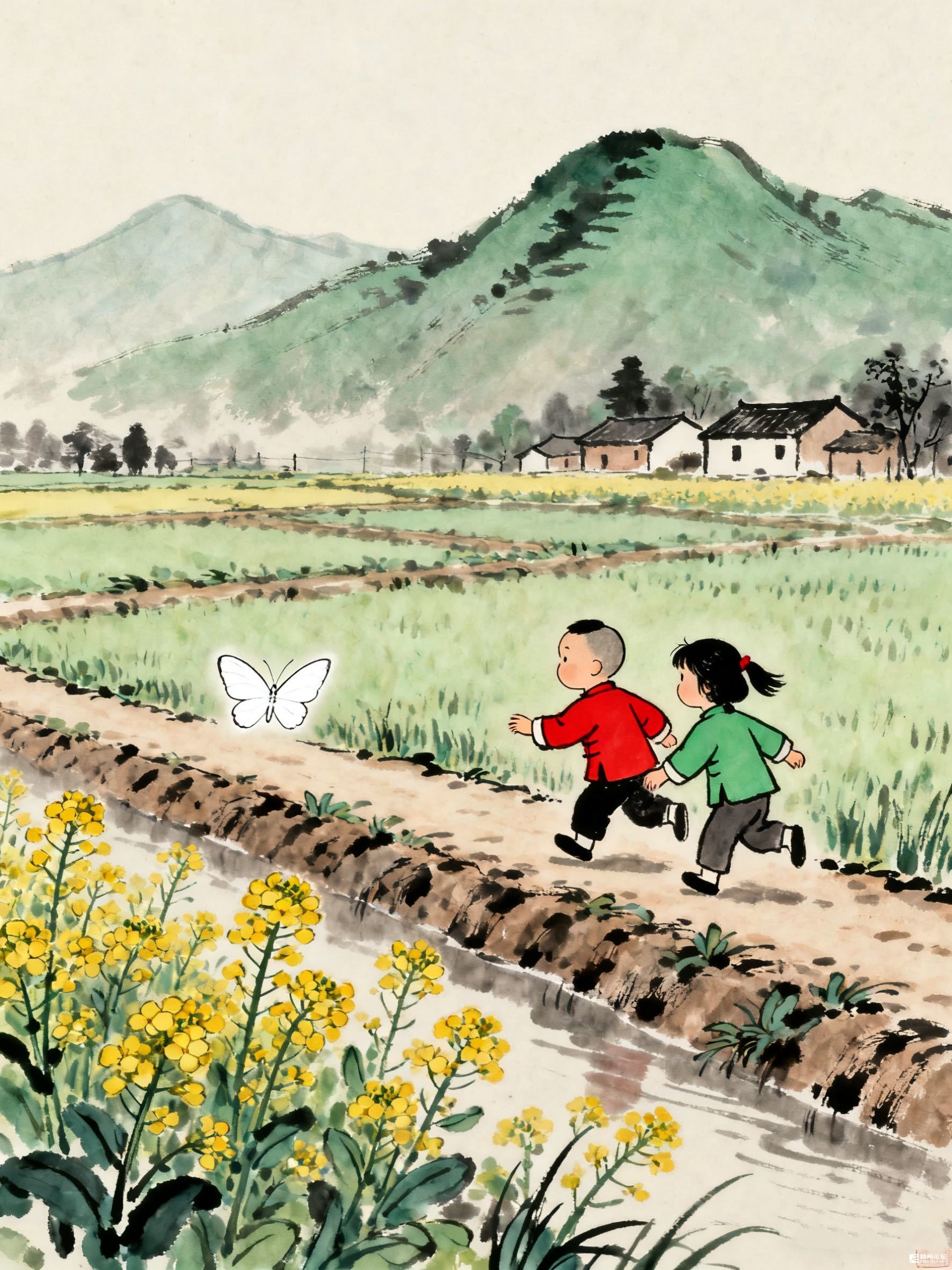 春风把田野吹成了调色盘 金黄的菜花沿着田埂铺到天边,溪水泛着亮,远处青山像浸在薄雾里的墨画。两个孩子追着白蝴蝶跑,红衫绿衣在绿田里一晃,像两颗会动的小果子,笑声惊飞了菜花上的蜜蜂。