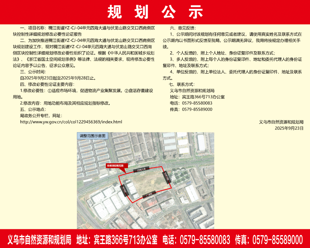 9月23日,义乌市稠江街道YZ-CJ-04单元四海大道与伏龙山路交叉口西南侧区 块控制性详细规划修改必要性论证报告公示。为加快推进稠江街道YZ-CJ-04单元四海大道与伏龙山路交叉口西南侧区块规划建设工作,现对稠江街道YZ-CJ-04单元四海大道与伏龙山路交叉口西南侧区块控制性详细规划修改必要性组织了论证。根据《中华人民共和国城乡规划法》、《浙江省国土空间规划条例》等法律、法规的相关要求,现将修改必要性论证内容予以公告,征求公众意见。