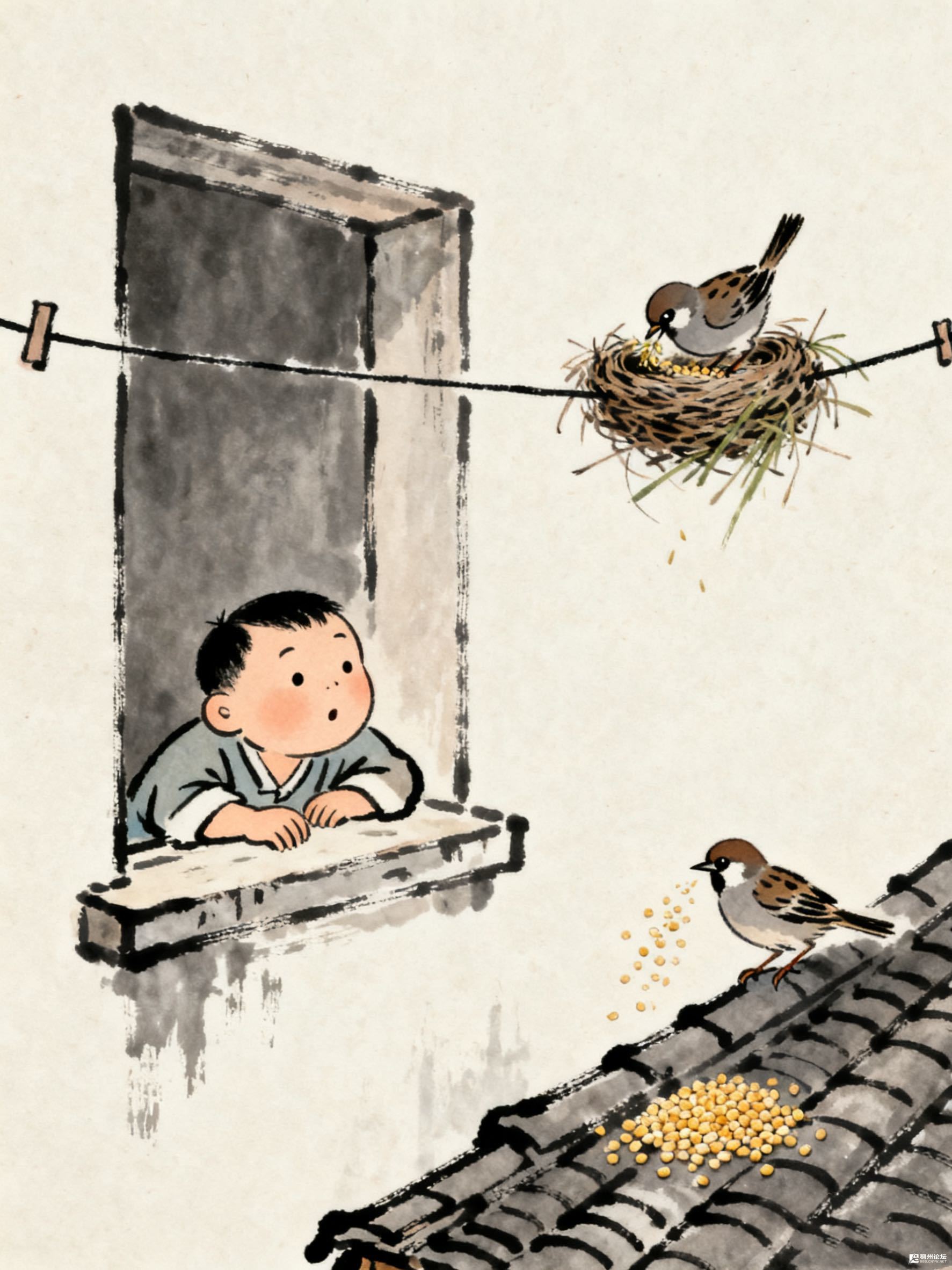 他悄悄攥了把玉米,轻手轻脚撒在屋檐瓦片上,然后赶紧缩回窗台,心脏“砰砰”跳,像藏着个小秘密。不一会儿,另一只麻雀落在屋檐,低头啄起玉米,窸窸窣窣的声响里,小娃的嘴角偷偷往上翘