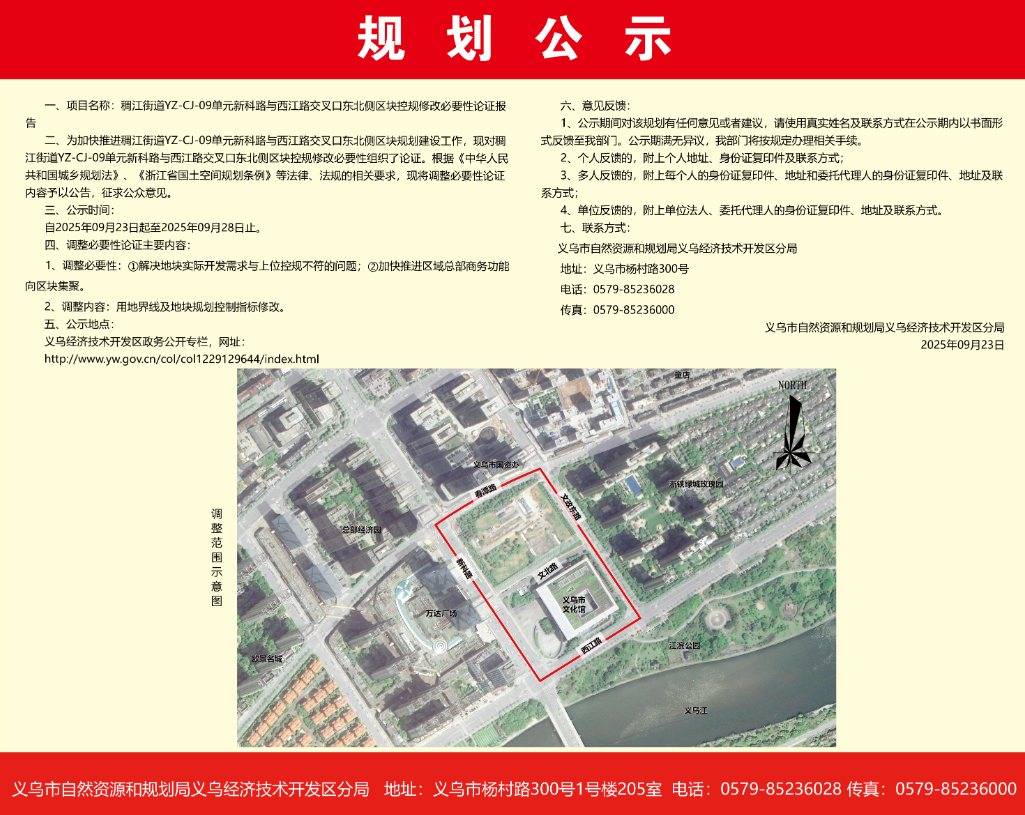 9月23日,义乌市稠江街道YZ-CJ-09单元新科路与西江路交叉口东北侧区块控规修改必要性论证报告公示。