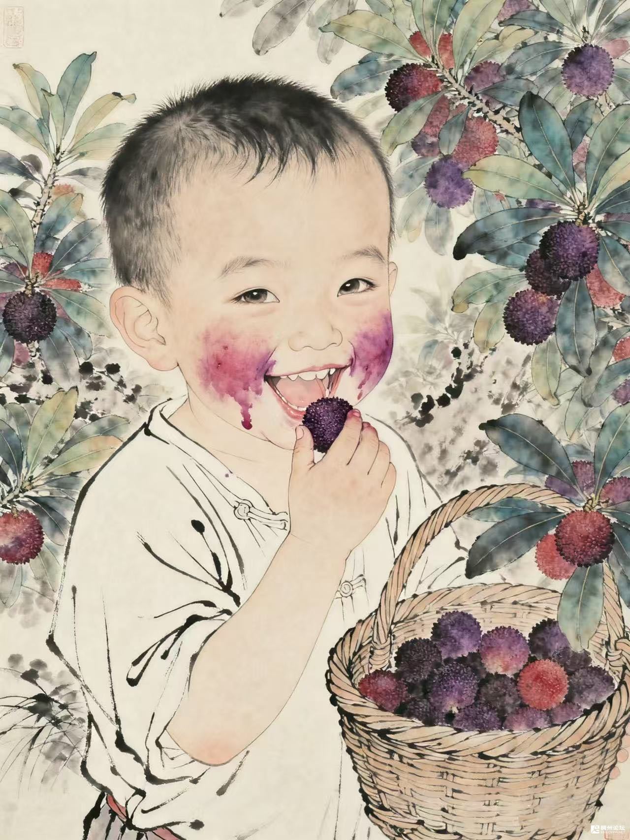 他顾不上擦,又抓了颗往嘴里送,腮帮子塞得鼓鼓的。忽然听见远处有脚步声,吓得往树后缩了缩,却忍不住咧开嘴笑,缺了颗乳牙的豁口露出来,脸上的紫渍顺着嘴角往下淌,活脱脱个闯了祸的“小怪物”,可眼里的光比杨梅还亮 手里的篮子早就装满了果子,滚来滚去的,像在替他“招供”这趟偷吃的快乐。