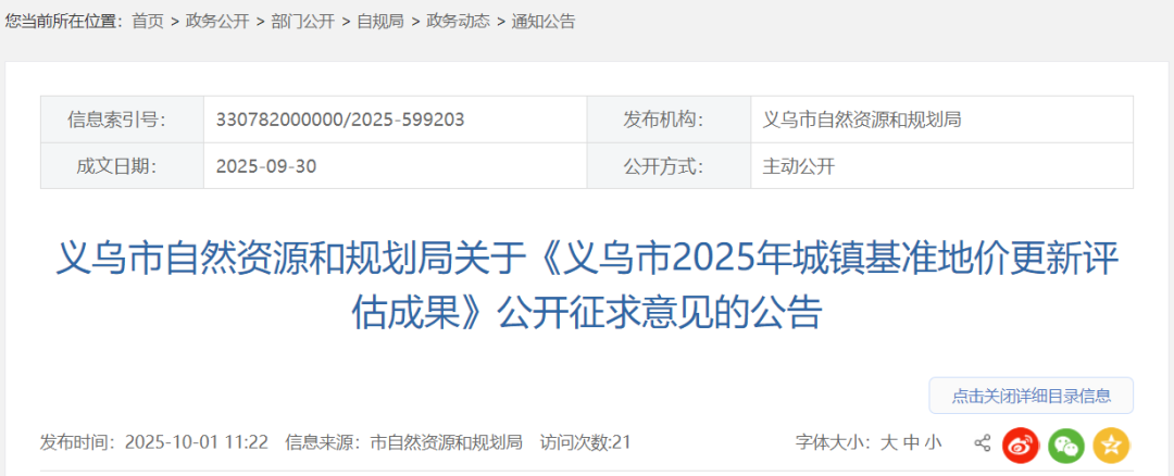义乌市自然资源和规划局关于《义乌市2025年城镇基准地价更新评估成果》公开征求意见的公告
