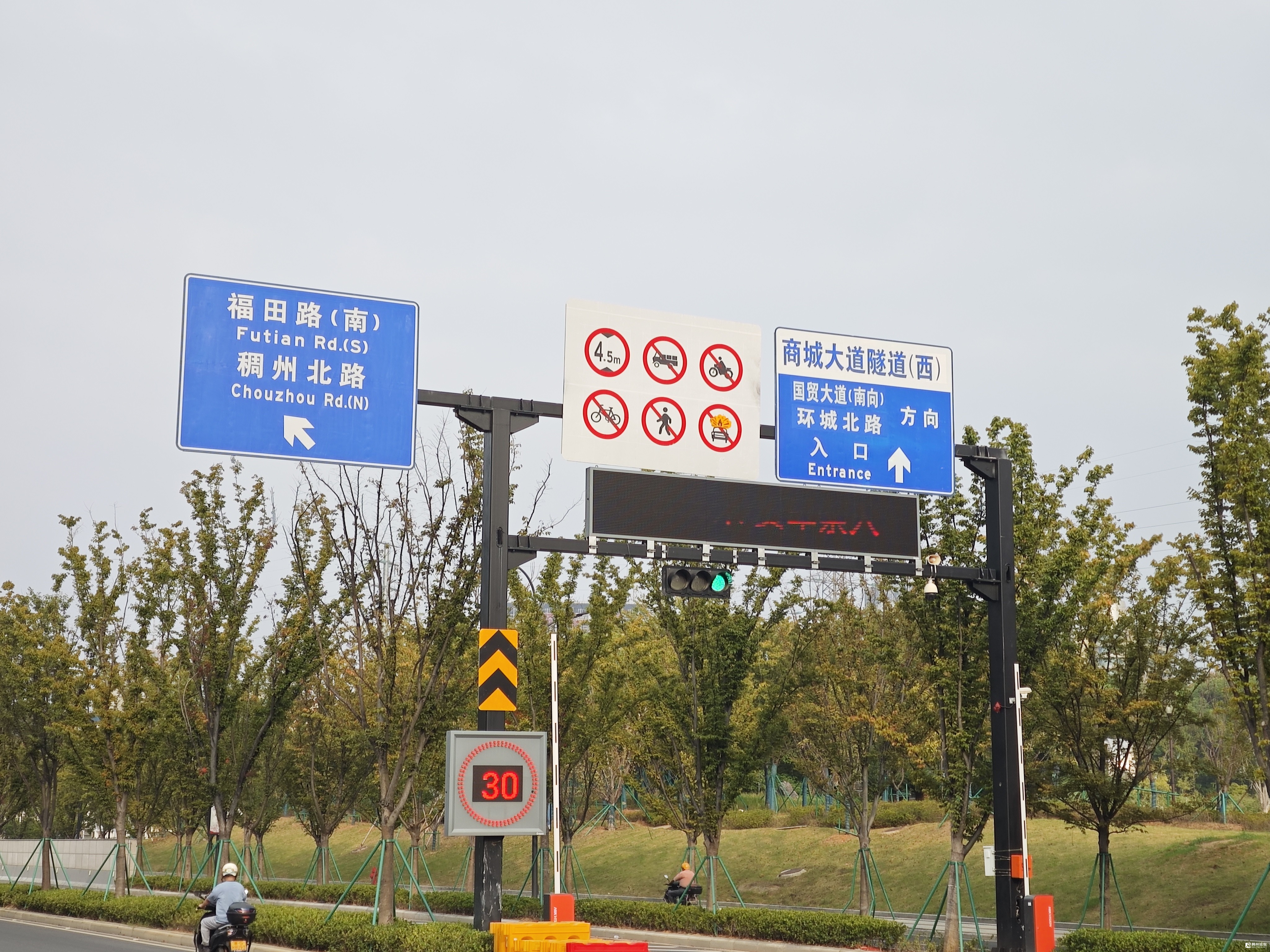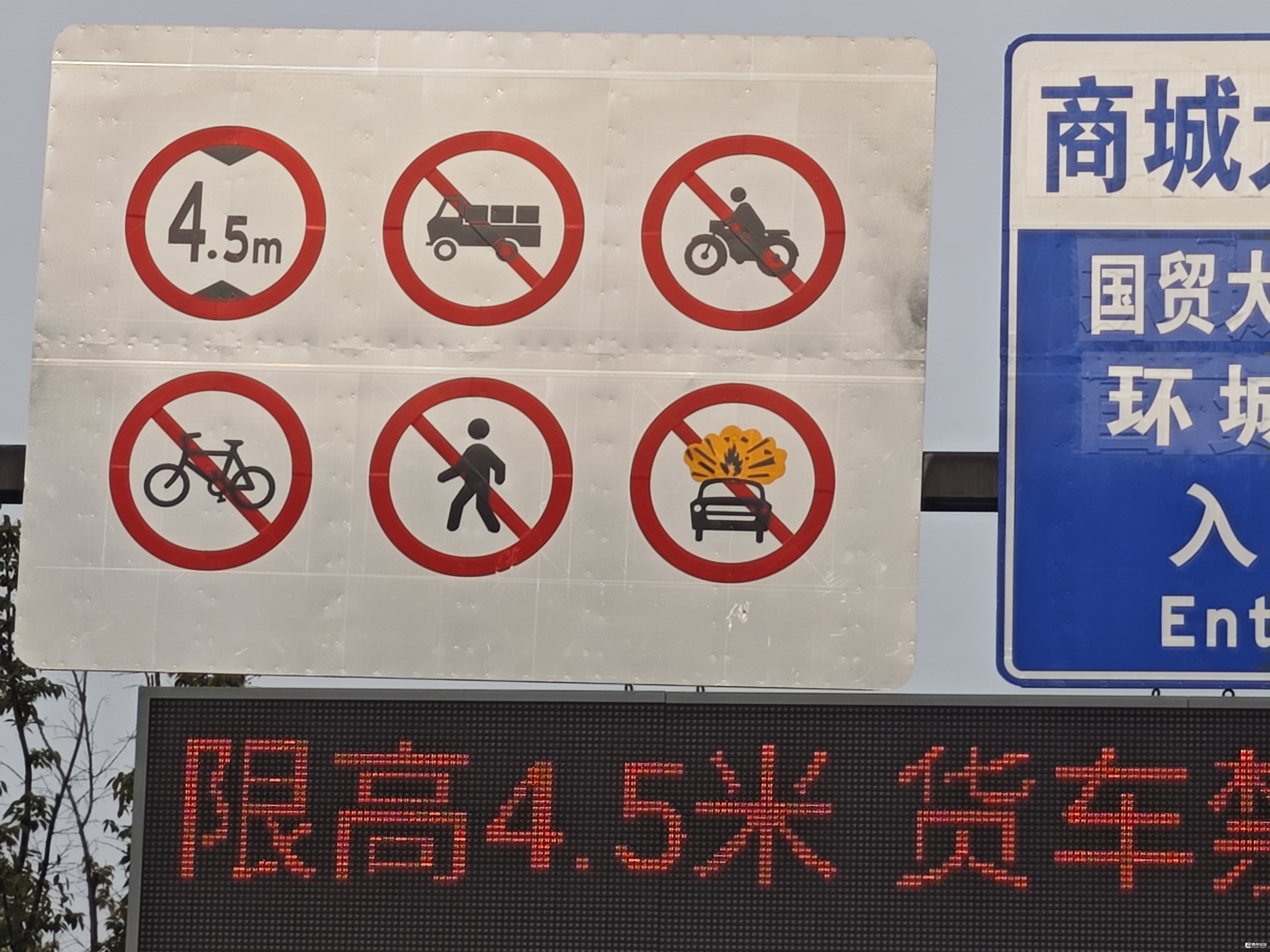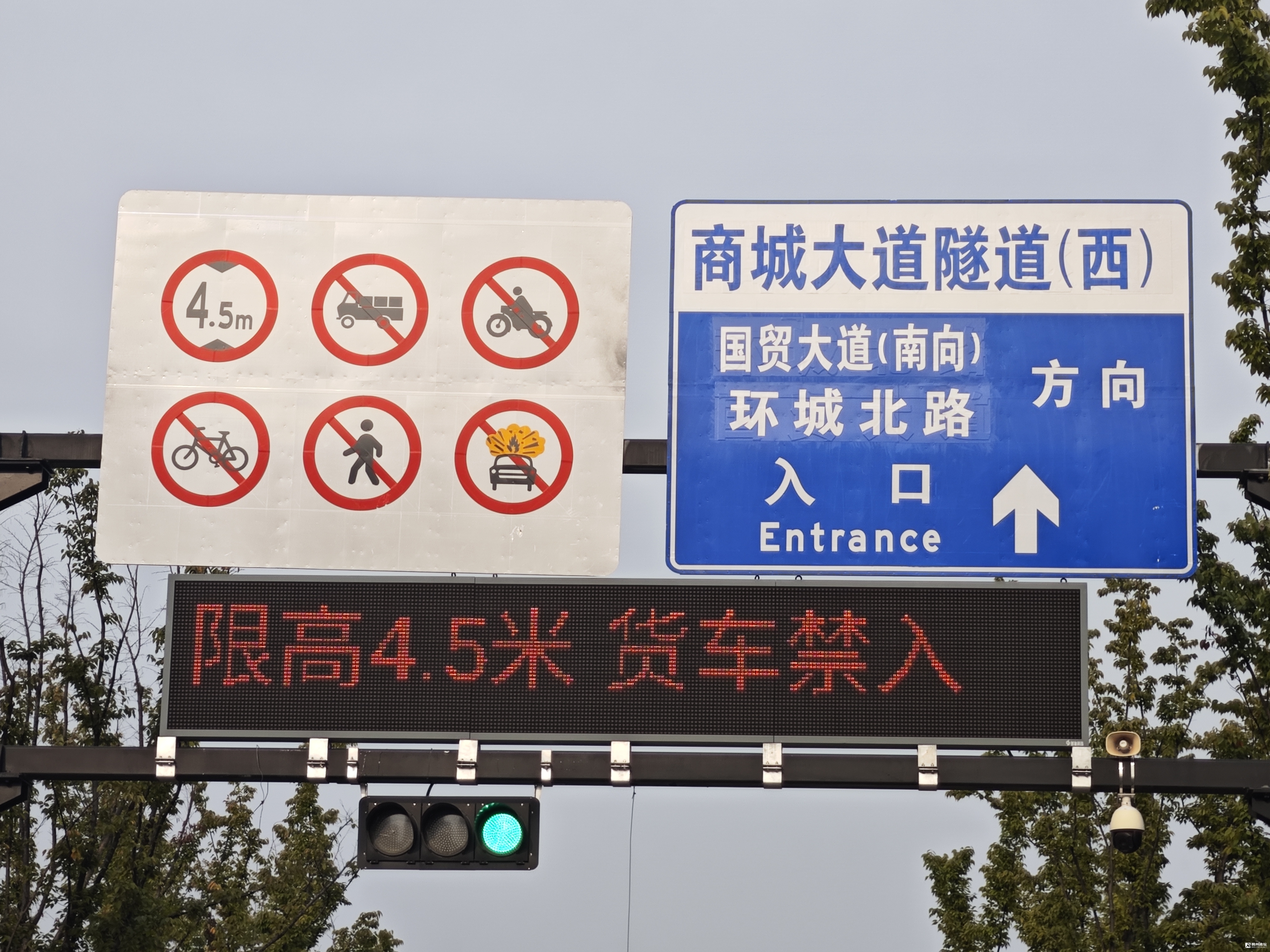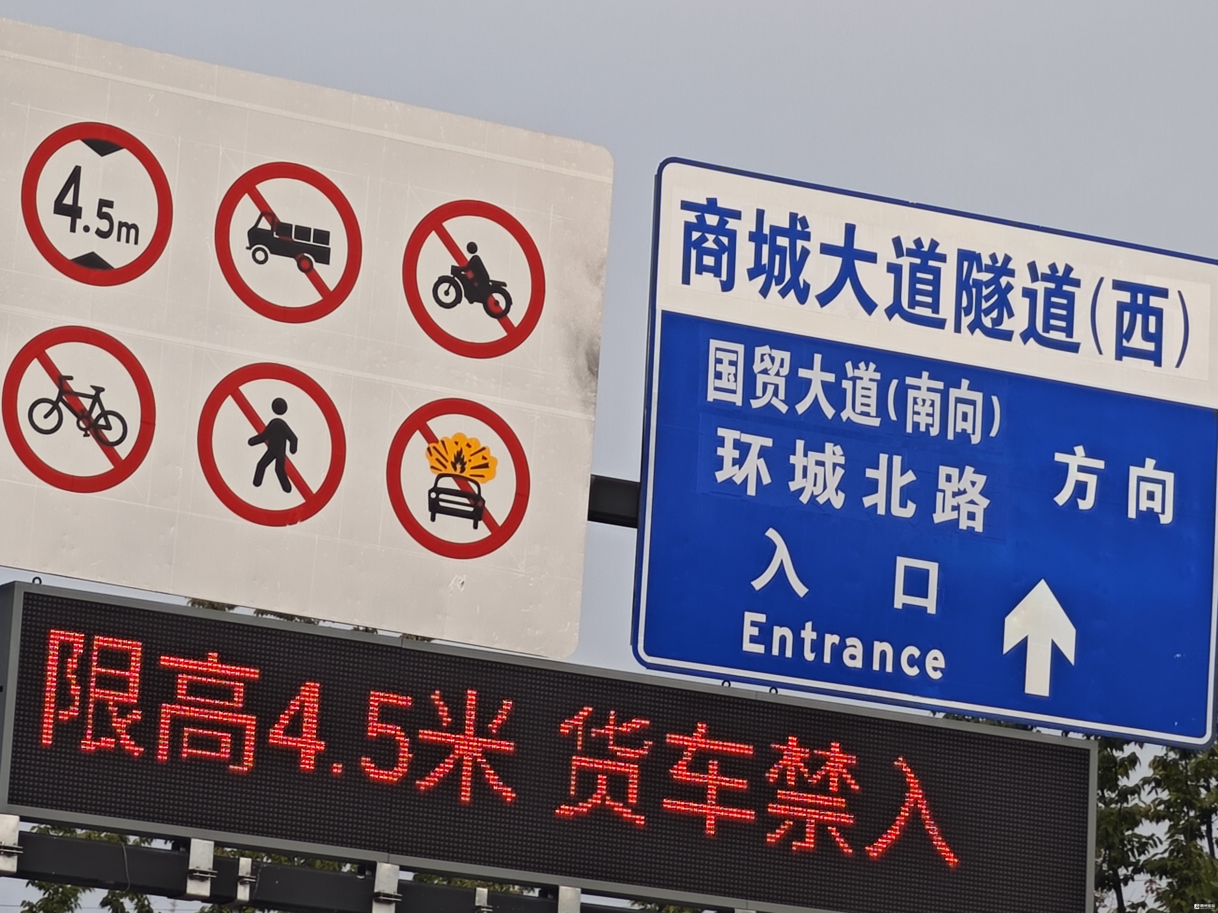 在隧道入口处,均有禁止货车通行的禁令标志,电子显示屏上,也有“限高4.5米,货车禁入”的醒目标语。可见,隧道内是明令禁止货车驶入的。