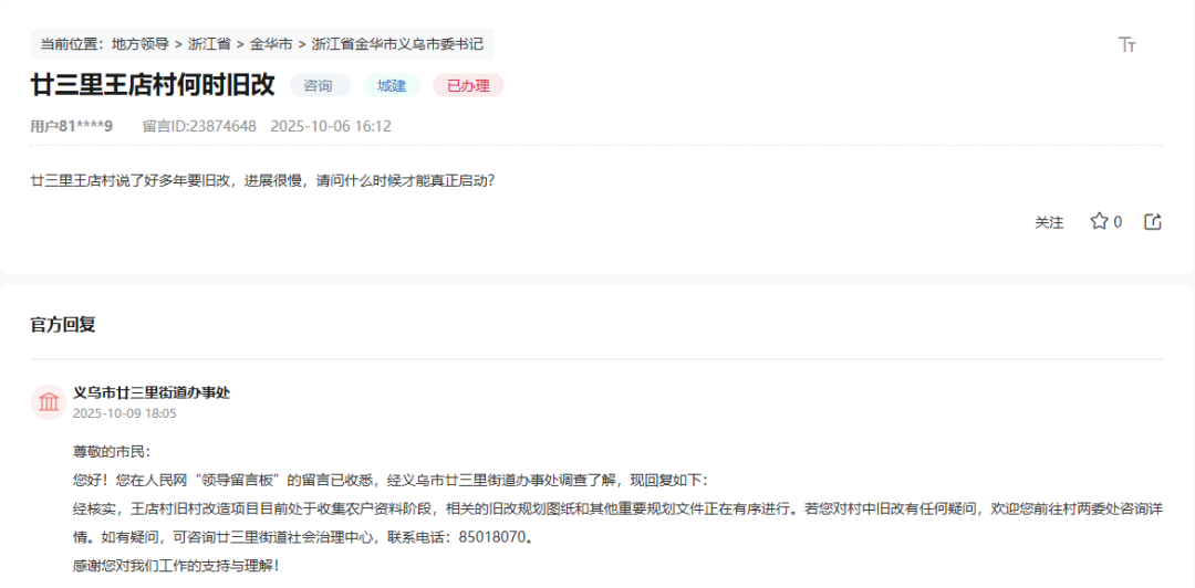 近日,有市民在网络平台咨询义乌农村旧村改造问题,现将有关部门答复进行整理汇总。