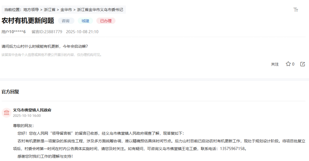 义乌市佛堂镇人民政府10月10日回复:农村有机更新是一项复杂的系统性工程,涉及多方面统筹协调,难以精确预估具体时间节点。后力山村目前已启动农村有机更新工作,现处于规划设计阶段。待项目批复立项后,村委会将第一时间在村内公告具体实施时间,请您及时关注。如有疑问,可咨询义乌市佛堂镇王宅工委,联系电话:13575967158。感谢您对我们工作的理解与支持!