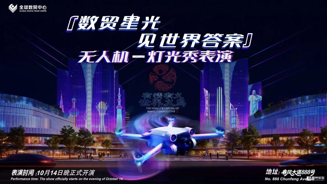 这场秀不玩“花架子”,每一束光、每一组无人机造型都在“讲故事”:从义乌传统贸易的烟火气,到全球数贸中心“第六代市场”的科技感,再到数字化赋能贸易的新蓝图,都将通过光影一点点铺展开。你看到的不仅是光影流转,是全球数贸中心这座新市场的初心与野心,更是“数贸义乌,开创未来”的底气!