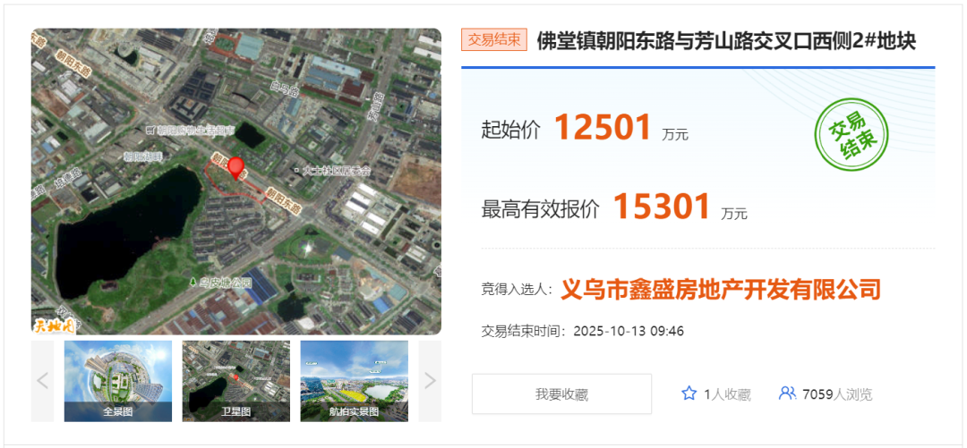 10月13日上午,经过29次出价,义乌市佛堂镇朝阳东路与芳山路交叉口西侧2#地块成功出让,地块成交价15301万元。朝阳东路与芳山路