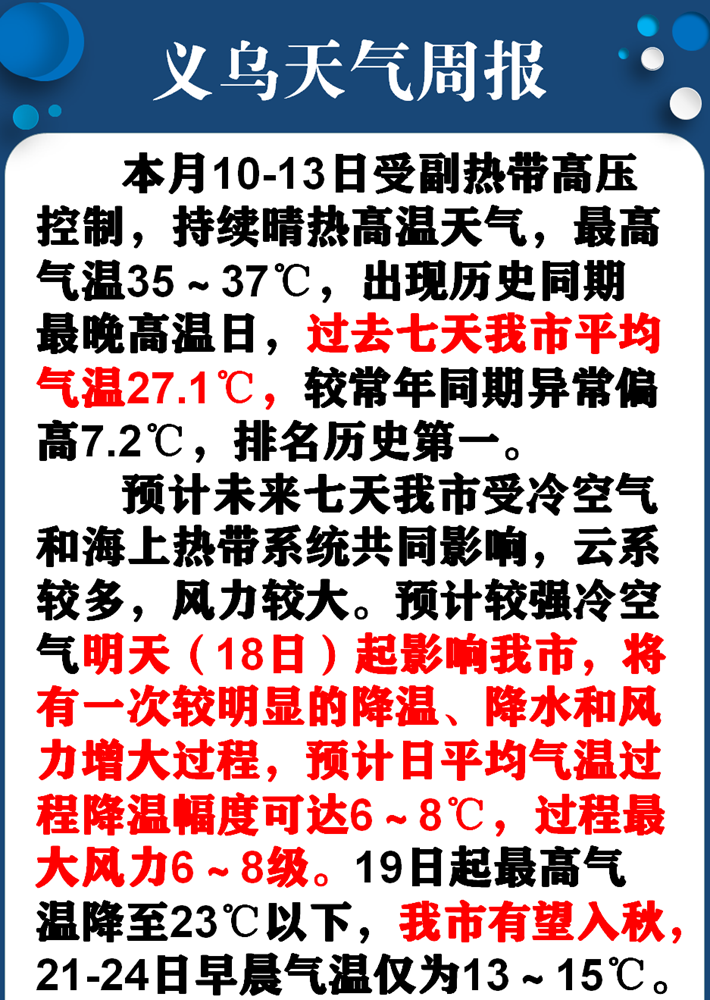 在经历了一场史无前例的晚夏高温后,义乌即将迎来一场剧烈的天气转折。根据义乌市气象台最新发布的天气周报,未来7天,义乌受冷空气和海上热带系统共同影响,云系较多,风力较大,10月18日(明天)起将有一次较明显的降温、降水和风力增大过程。义乌有望在本周末实现“一夜入秋”,迎来气象意义上的秋天。