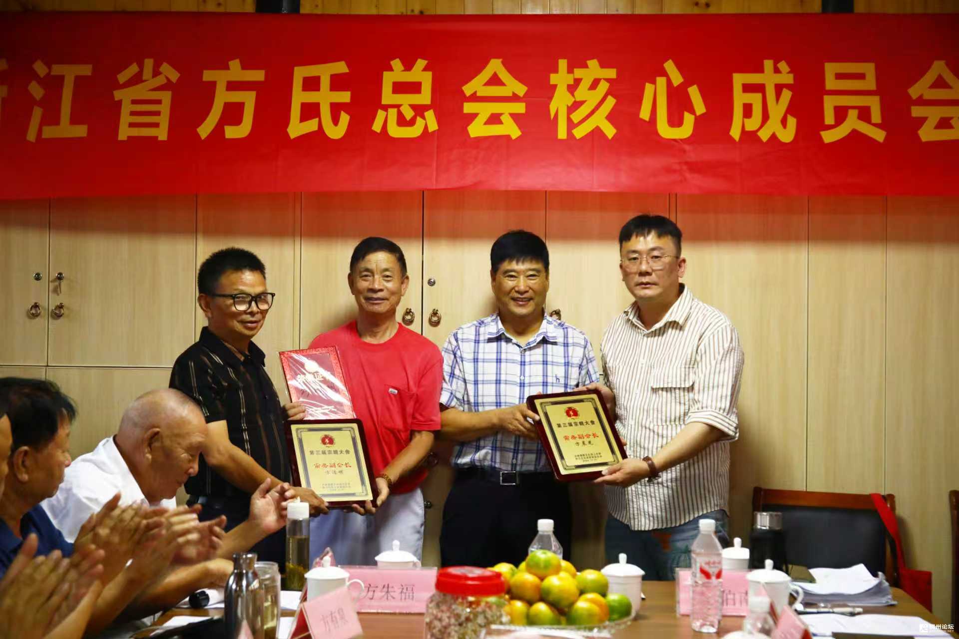 会议的重要环节之一,是荣誉授牌与证书颁发仪式。省方氏总会会长方浩福、执行会长方以象共同为成员方晨光、方浩明授予荣誉牌匾,并颁发荣誉证书,以此表彰二人在宗亲联谊、文化传承等工作中作出的积极贡献,也为全体成员树立了学习榜样。
