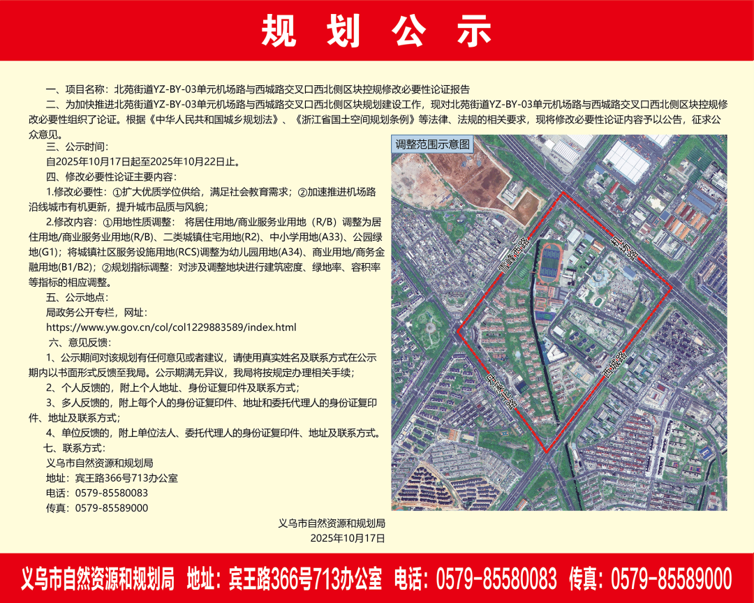 二、为加快推进北苑街道YZ-BY-03单元机场路与西城路交叉口西北侧区块规划建设工作,现对北苑街道YZ-BY-03单元机场路与西城路交叉口西北侧区块控规修改必要性组织了论证。根据《中华人民共和国城乡规划法》《浙江省国土空间规划条例》等法律、法规的相关要求,现将修改必要性论证内容予以公告,征求公众意见。