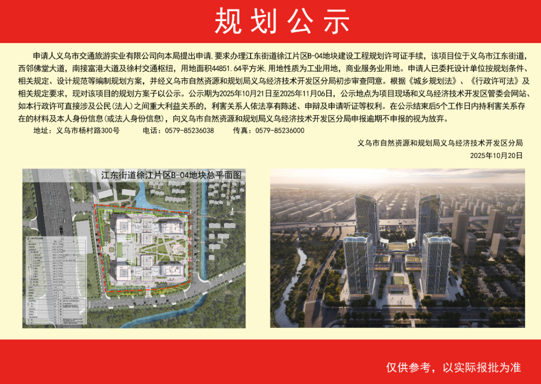 10月20日,义乌市江东街道徐江片区B-04地块项目方案规划公示。申请人义乌市交通旅游实业有限公司向义乌市自然资源和规划局义乌经济技术开发区分局提出申请,要求办理江东街道徐江片区B-04地块建设工程规划许可证手续,该项目位于义乌市江东街道,西邻佛堂大道,南接富港大道及徐村交通枢纽,用地面积44851.64平方米,用地性质为工业用地、商业服务业用地。