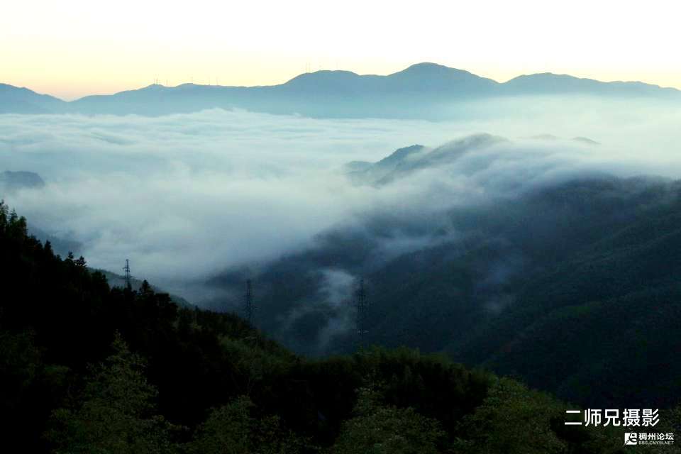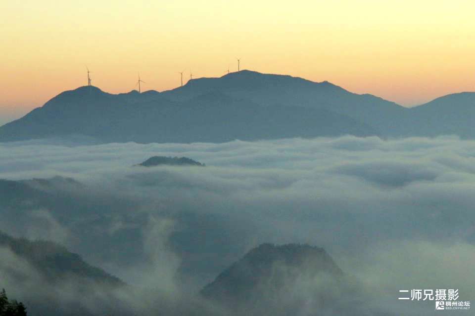 眼前的一幕令我不由地惊叹:啊!太美了!远处蜿蜒的山脊线描出墨色的轮廓,脚下万千沟壑与深谷皆被云雾填满,是不是精卫一夜填海?仿佛天堑已成通途,可以踏云而行,直抵对面峰顶,拔下一只只风车。脚下是漫漫云海,灰蒙蒙一片,一团团、一簇簇、一缕缕云雾紧紧相拥,贪睡在这万籁俱寂的清冷早晨。