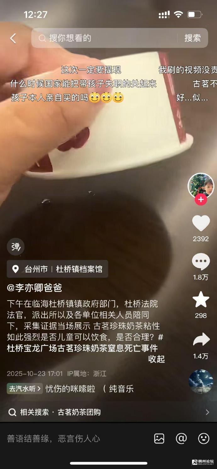 这个事情大家关注了吗?三岁小孩在游乐园喝珍珠奶茶结果被珍珠呛死 确实很可怜 但是父母问责奶茶店是否是无理取闹了,责任最大的难道不是监护人吗?经评论区UU更正:是孩子喝了珍珠奶茶以后玩蹦床然后反流导致窒息 但是不管怎么说这都跟奶茶店没关系吧