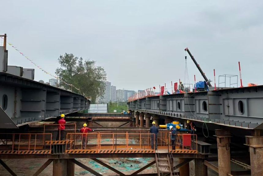 本次施工采用的是“顶推滑移”技术。施工过程中,通过计算机精准控制液压顶推设备,如“穿针引线”般将钢箱梁沿设计轴线平稳滑移至预定桥位并完成换撑。面对跨度大、自重大、同步控制精度要求高等挑战,双江湖集团借助BIM技术预先模拟,结合传感器实时监测,成功实现毫米级精准对接,有效实现超大、超重钢箱梁节段的高精度空间定位与姿态调整,在保障安全的同时,显著提升了作业效率。