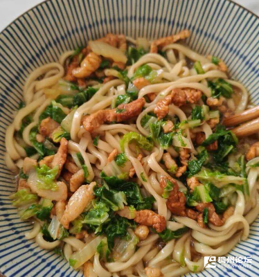 准备食材:面条、猪肉、小白菜。配料:花生油、生抽、老抽、蚝油、盐、胡椒粉、淀粉。具体做法: 猪肉先切片再切长条,加老抽、胡椒粉和淀粉抓拌均匀,腌制十分钟左右。