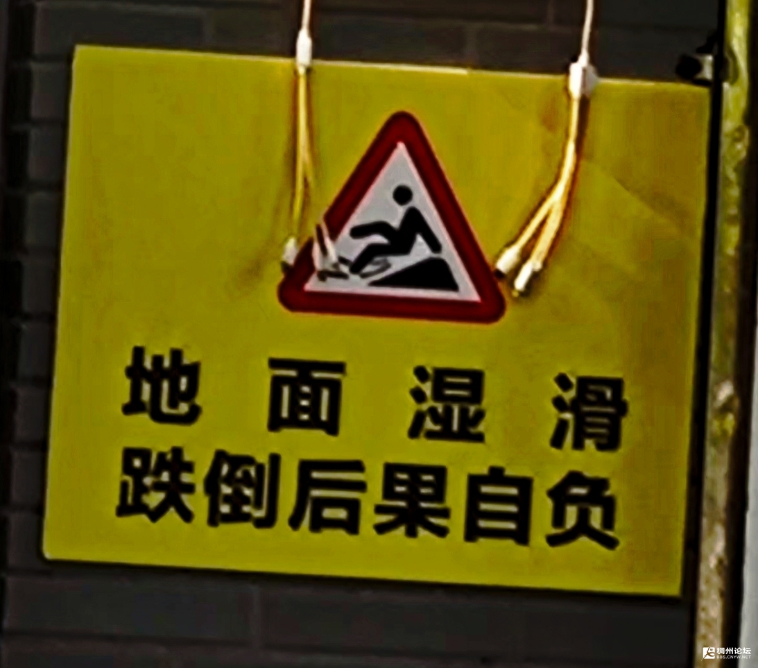 “地面湿滑,跌倒后果自负”。