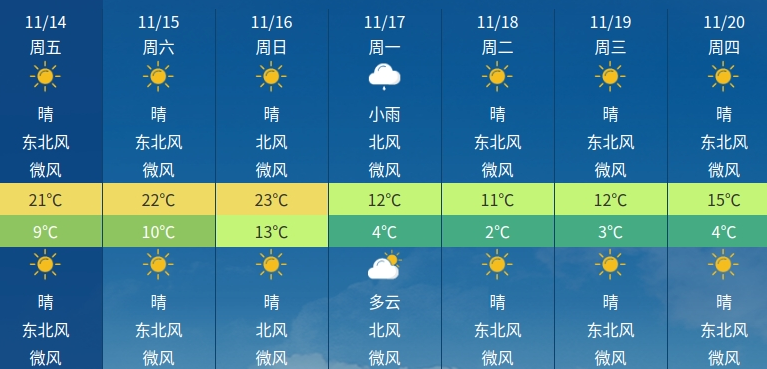 11月14日(星期五):晴到多云,温度9℃~21℃。