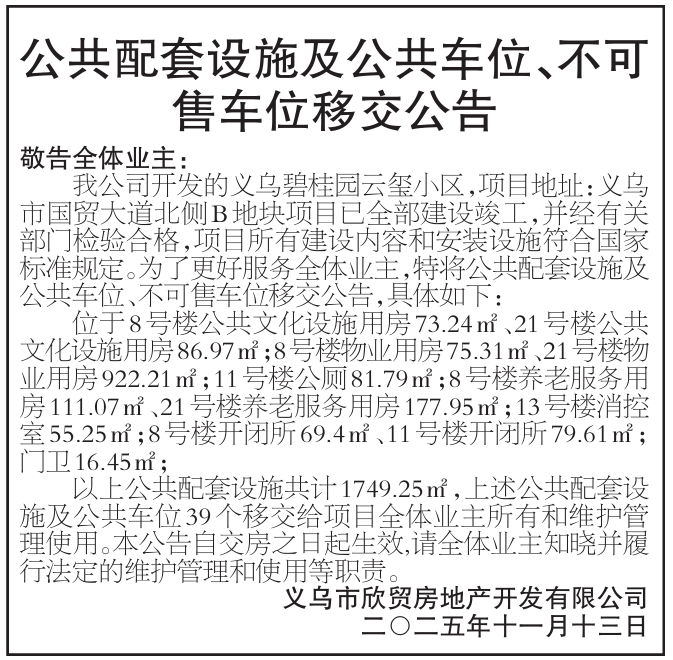 我公司开发的义乌碧桂园云玺小区,项目地址:义乌市国贸大道北侧B地块项目已全部建设竣工,并经有关部门检验合格,项目所有建设内容和安装设施符合国家标准规定。为了更好服务全体业主,特将公共配套设施及公共车位、不可售车位移交公告,具体如下:位于8号楼公共文化设施用房73.24㎡、21号楼公共文化设施用房86.97㎡;8号楼物业用房75.31㎡、21号楼物业用房922.21㎡;11号楼公厕81.79㎡;8号楼养老服务用房111.07㎡、21号楼养老服务用房177.95㎡;13号楼消控室55.25㎡;8号楼开闭所69.4㎡、11号楼开闭所79.61㎡;门卫16 .45㎡;以上公共配套设施共计1749.25㎡,上述公共配套设施及公共车位39个移交给项目全体业主所有和维护管理使用。本公告自交房之日起生效,请全体业主知晓并履行法定的维护管理和使用等职责。 |