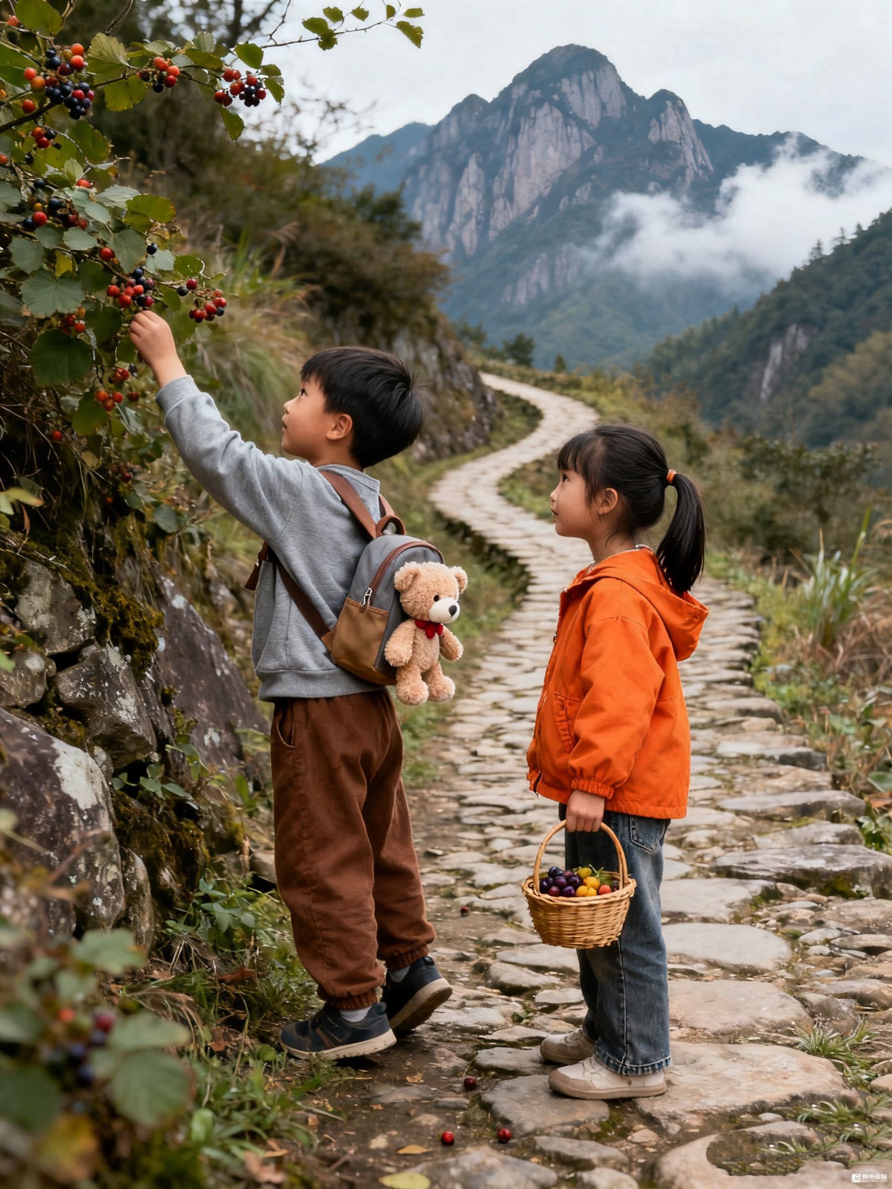 山间石径蜿蜒,云雾在峰峦间缠卷。男孩够着枝头的红果,背包上的小熊晃悠悠;女孩提着满篮野果,橘色外套在绿意里鲜亮。野莓的红紫、草木的苍绿、远山的灰蓝,把秋山的野趣铺得满满