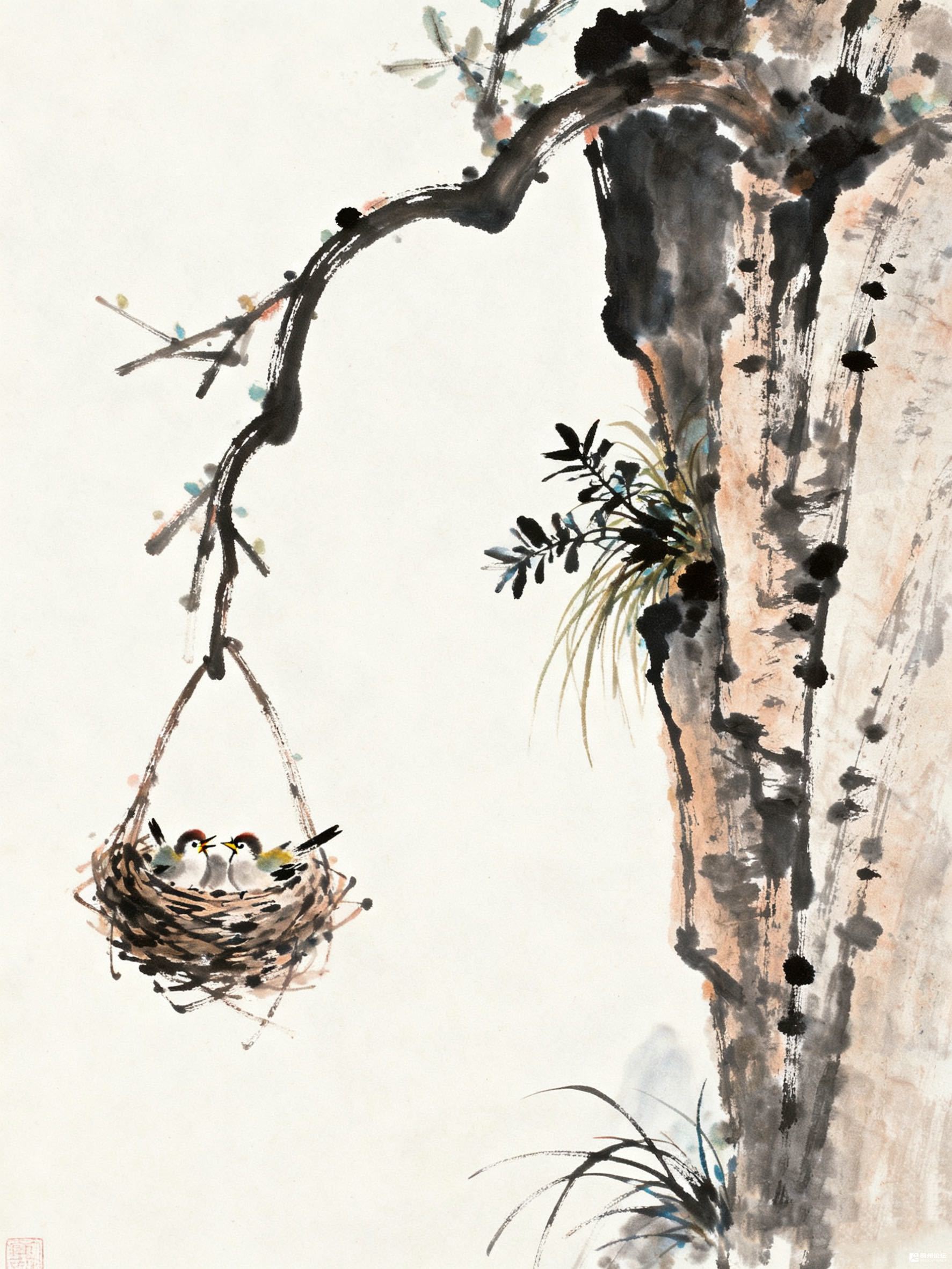 老树枝干苍劲,墨色的枝桠间,悬着个草巢,巢里两只雀鸟依偎着,羽色棕白相间,红喙小巧,似在低语。树干的肌理斑驳,旁生的丛草劲挺,把巢的温馨衬得刚好