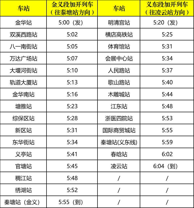 一、金华站单向加开1列次站站停载客列车至秦塘站(无义东段换乘列车),始发站为金华站,发车时间为5:00。