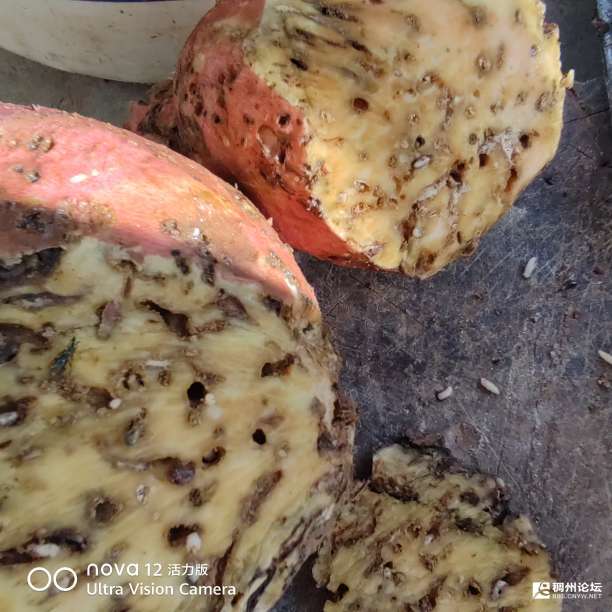 今年田里到处都扔满了被虫咬过的红薯,有的人就干脆不挖了,不是一般的咬一点,一个红薯从皮到里每寸都有虫生长,挖了放家了虫还在侵蚀,如图,剖开惨不忍睹,毛骨悚然,一条条小虫尽显其中。给鸡吃,鸡都不吃。有人风趣说,“最后一场大雨下的不是雨,而是虫子”。