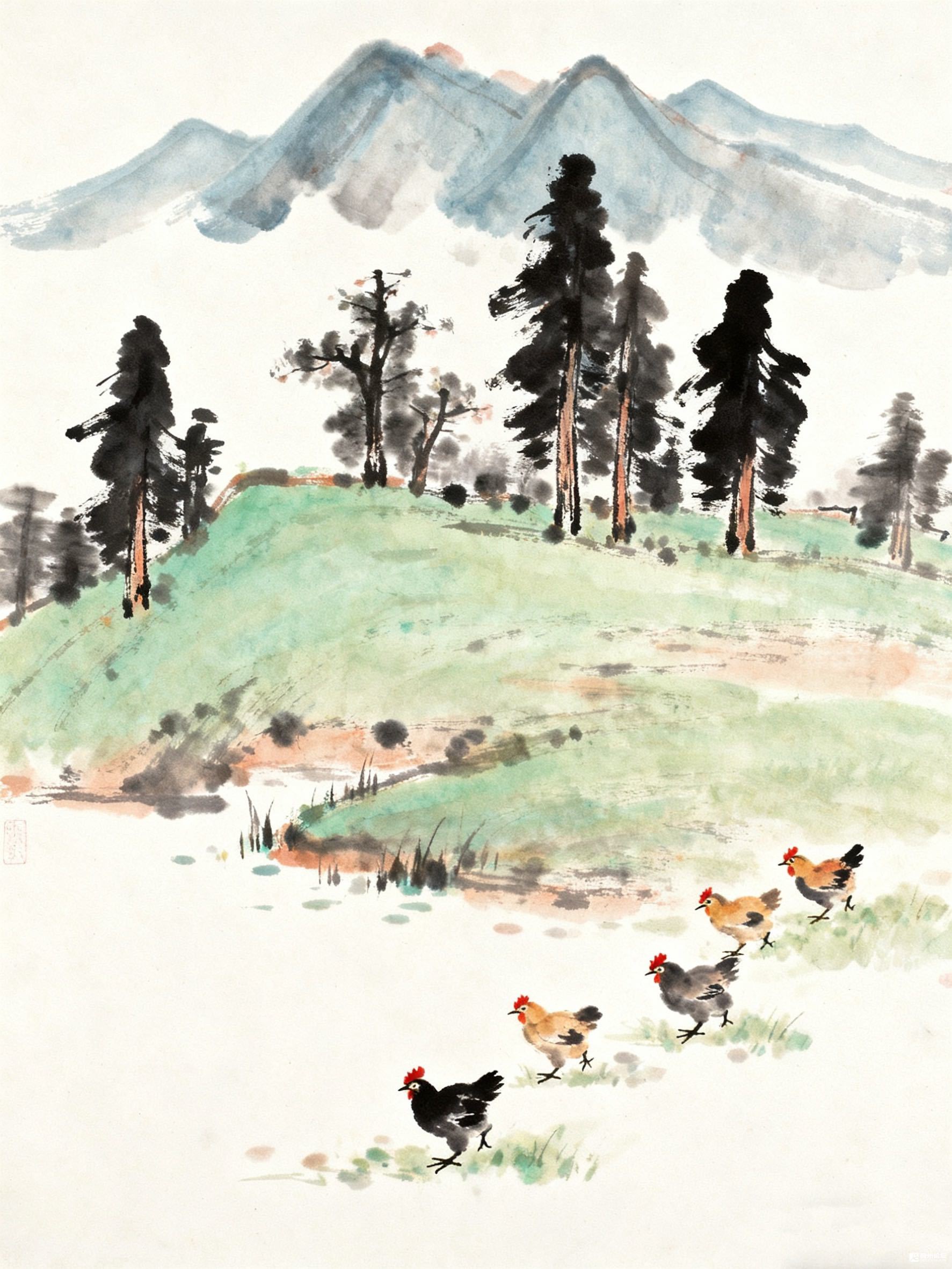 远山用淡墨晕得朦胧,青绿的坡上,黑松挺拔,几棵杂树疏朗。坡下的草地上,几只鸡或黑或黄,红冠鲜亮,正悠闲地踱步。溪水在坡边隐约,把乡野的宁静衬得刚刚好