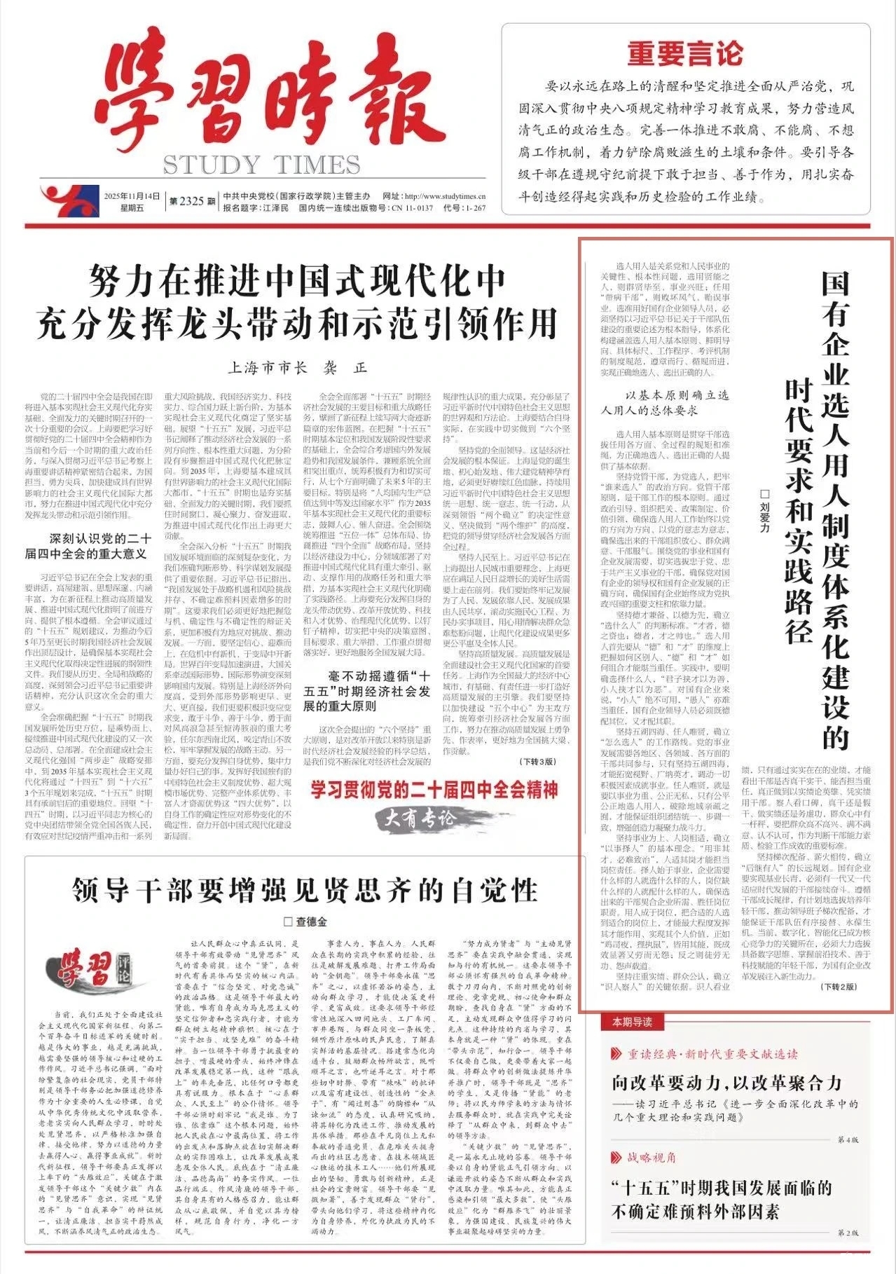 近日,《学习时报》刊发中国邮政集团有限公司党组书记、董事长刘爱力的署名文章《国有企业选人用人制度体系化建设的时代要求和实践路径》。全文如下: