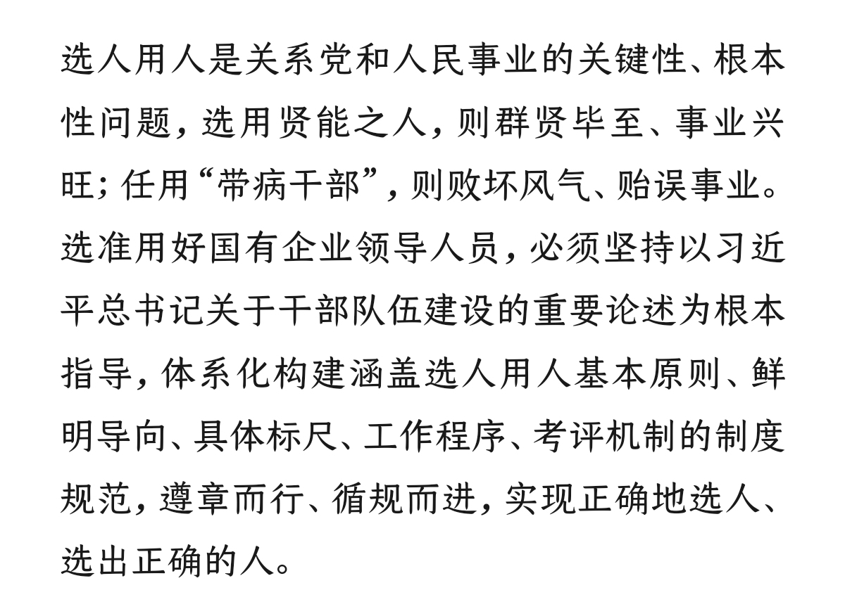 坚持党管干部,为党选人,把牢“谁来选人”的政治方向。党管干部原则,是干部工作的根本原则。通过政治引导、组织把关、政策制定、价值引领,确保选人用人工作始终以党的方向为方向、以党的意志为意志,确保选出来的干部组织放心、群众满意、干部服气。围绕党的事业和国有企业发展需要,切实选拔忠于党、忠于共产主义事业的干部,确保党对国有企业的领导权和国有企业发展的正确方向,确保国有企业始终成为党执政兴国的重要支柱和依靠力量。