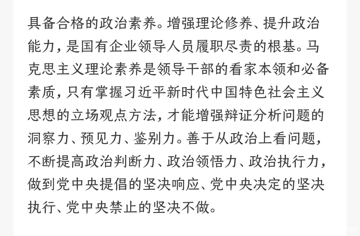 具备相应的履职能力。要有广泛的任职经历,只有经历扎实的岗位历练,才能练就担当重任的宽肩膀、具备统筹改革发展复杂局面的能力。有丰富的实践经验,学习庖丁解牛,只有真正“解过牛”、干过事,才能了解“牛”、了解从事的工作,成为所在领域的行家里手。有深厚的专业素养,具备专业思维、专业方法、专业知识、专业精神,做到正确决策、科学发展。