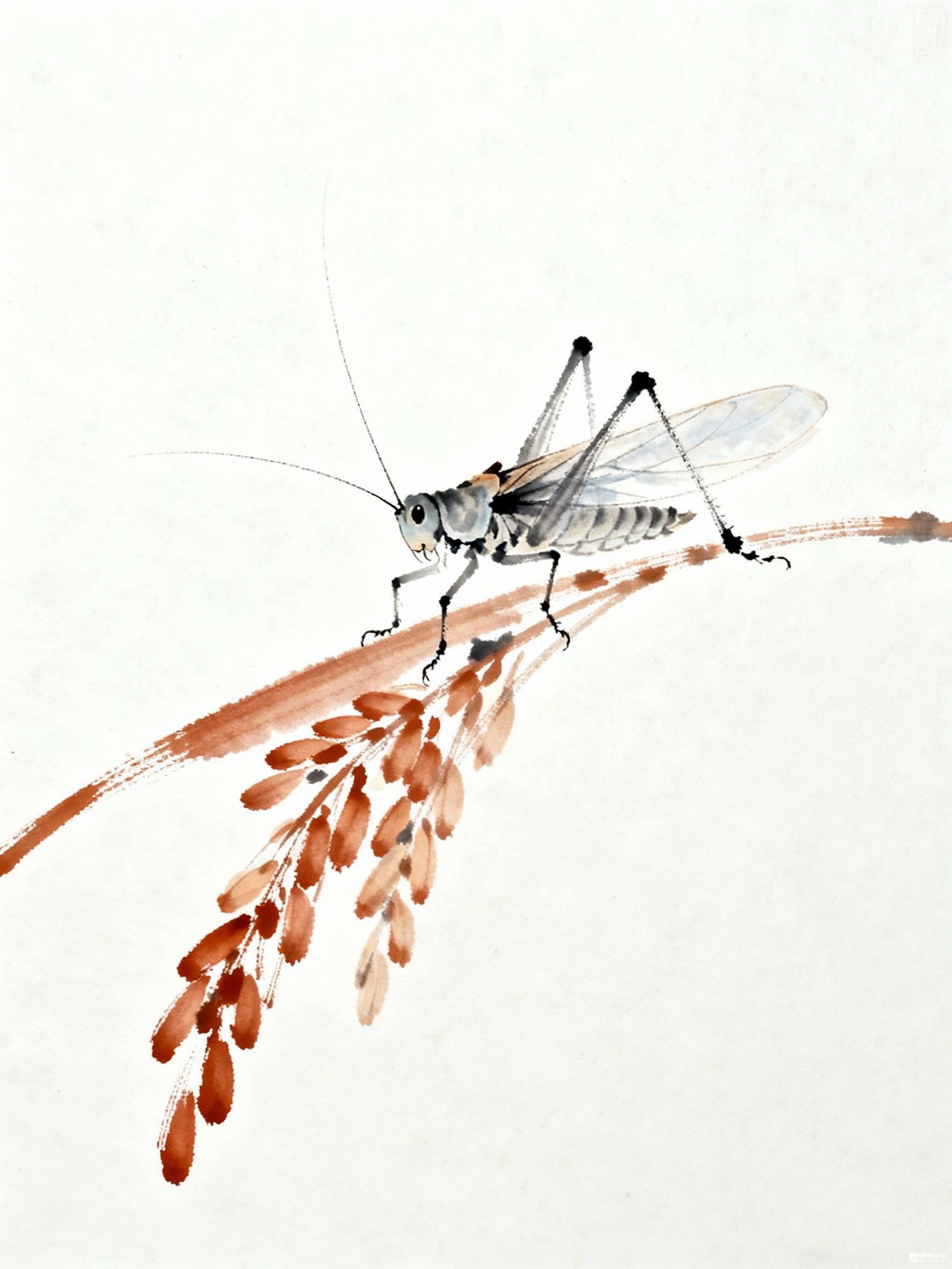 这画面里,稻的丰、虫的灵、笔的精,融成了幅秋收小景。蚱蜢的姿态鲜活,仿佛下一秒就要振翅跳跃,小身影在稻穗上,把田野的生机都凝在了纸间。
