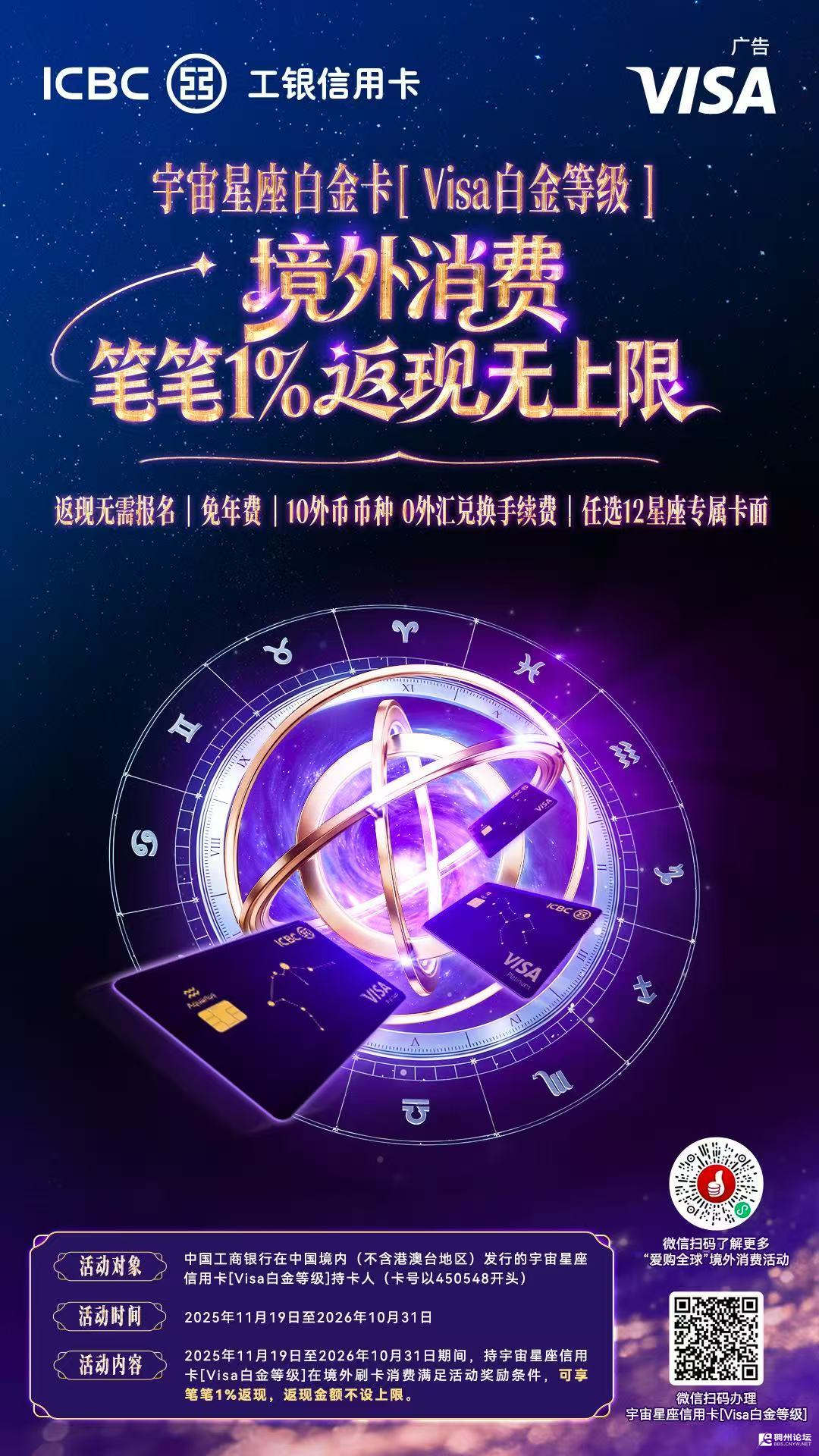 近日,中国工商银行为出境消费客户送上重磅福利——旗下广受年轻客群青睐的Visa宇宙星座白金信用卡,正式新增境外消费笔笔1%无上限返现权益,活动自2025年11月19日起持续至2026年10月31日,覆盖全年出境消费黄金周期,搭配多币种免外汇兑换手续费、免年费、12星座专属卡面等核心优势,为出境游客户与留学生群体带来更贴心、更优惠、更便利的跨境支付体验。