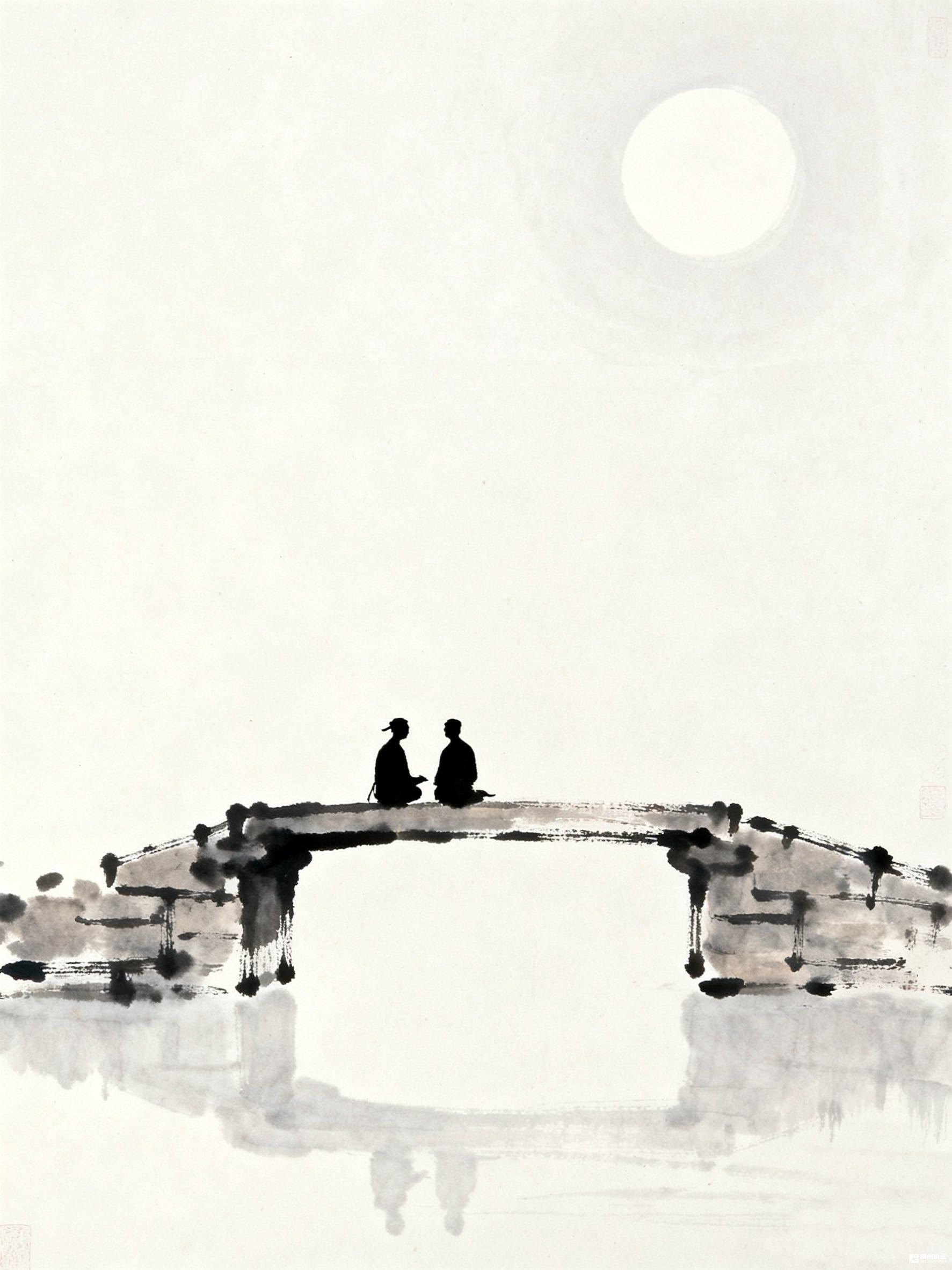 月下石桥,墨色简淡,桥身的皴笔苍劲,倒影在水面晕开。桥上两人剪影相对,似在低语,衣袂简约,在素白的天地间,把夜的静衬得深长