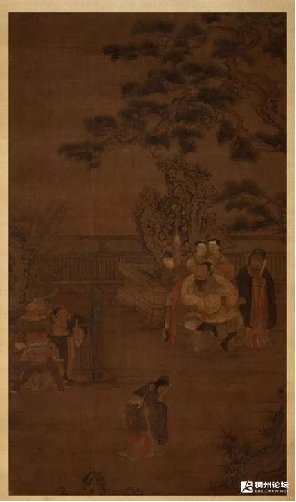 这幅宋代佚名画反映的是西汉时期槐里(曾今是陕西的一个县)县令朱云(字子游),因难以容忍同朝臣子西汉丞相安昌侯张禹的腐败,请求汉成帝赐予上方宝剑杀之,却惹来杀身之祸,勃然大怒的成帝下令将朱云推出斩首,朱云攀住殿槛力争,以致把它折断了。此画表现的就是这个情节,所以称为“折槛图”。画的主人公朱云(义乌朱氏祖先之一)性格刚烈,身高一米八几的他以一个小小槐里县令身份,当着众人的面请求汉成帝赐予他上方宝剑,杀掉皇帝的红人张禹丞相,当场把皇帝老子惹火了,下令将朱云推出去斩首,这位小县令傲骨凛然,临危不惧,攀住殿槛力争,以致折断了门槛(哈哈,原来我们义乌人的性格早就形成)。图的右边那个黑衣人就是张禹,一副腐败臣子的狡诈嘴脸。后经大臣力劝,保住了朱云的性命。