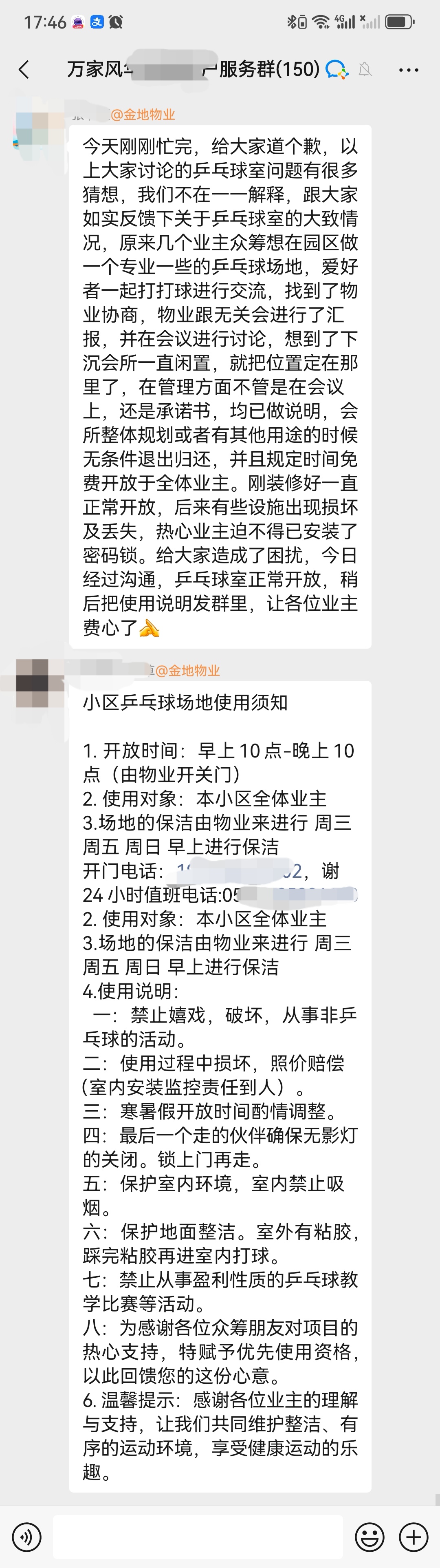 <p>12月2日事件更新,本人就此事联系物业,拿到了所谓的热心业主和物业签订的承诺书,公共区域房间被侵占是我11月30日发现的,相关会议纪要是10月份的,承诺书却是12月1日签字的,微信聊天记录的通知是事件曝光后12月2日更新的。</p><p>据了解,所谓热心业主共计20余名,目前签字承诺书有十几人,个别热心业主不方便签字。注意后面这句,这几个不方便签字的原因是:因为个别人是街道上班的工作人员(这是物业工作人员的原话)。</p><p>事情截止到发评论,小区公共区域被热心业主私人出资使用这个问题是否合法合规暂且不议(留给相关部门处理),不过目前乒乓球馆按照物业发出来的话是已经给全体业主开放,时间早上10点到晚上10点。</p><p><br /></p>
