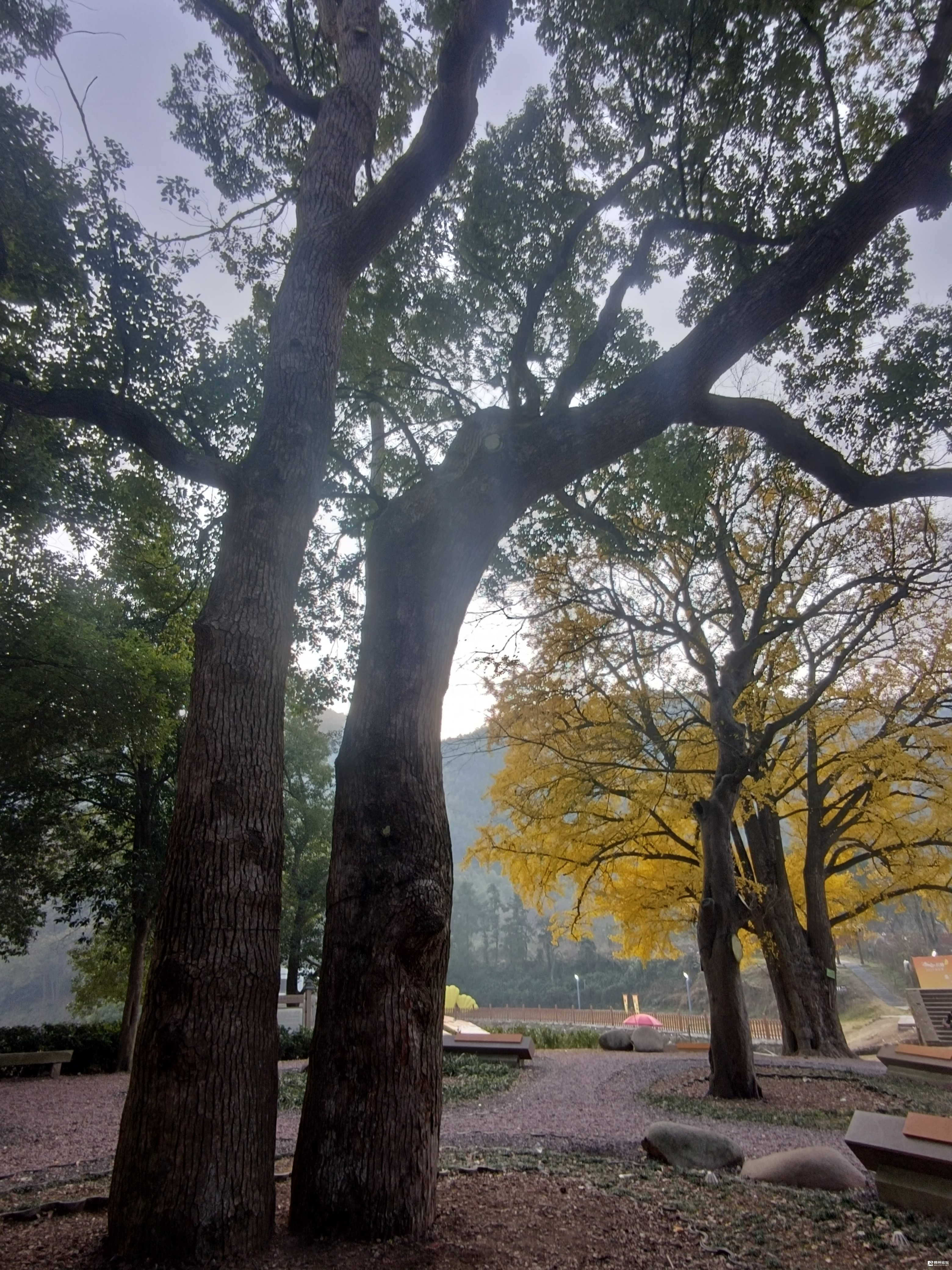 银杏不远处,两株相依的樟树撞入眼帘 , 那是当地人心中的 “夫妻樟”,大水桶般粗的树干,高大而挺拔,浓绿的叶片,在初冬时节里透着温润的生机。