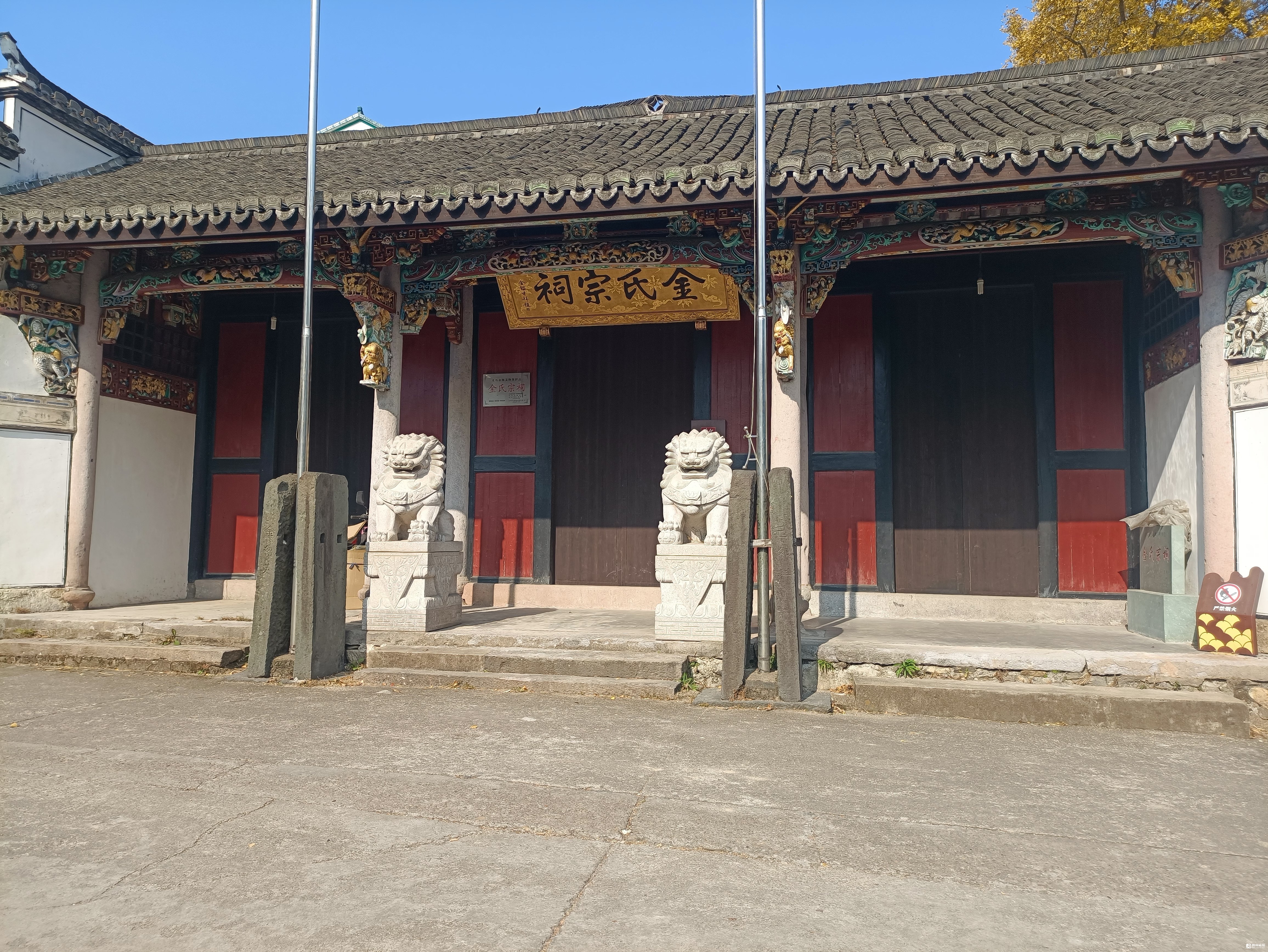 金氏祠堂的飞檐翘角,在初冬阳光中若隐若现,青砖黛瓦,雕梁画栋间透着岁月的沉静,而祠堂东边,一株五百八十多年的银杏树,高大而挺拔地静静伫立着,它与古祠堂相映成一幅清雅的画卷。