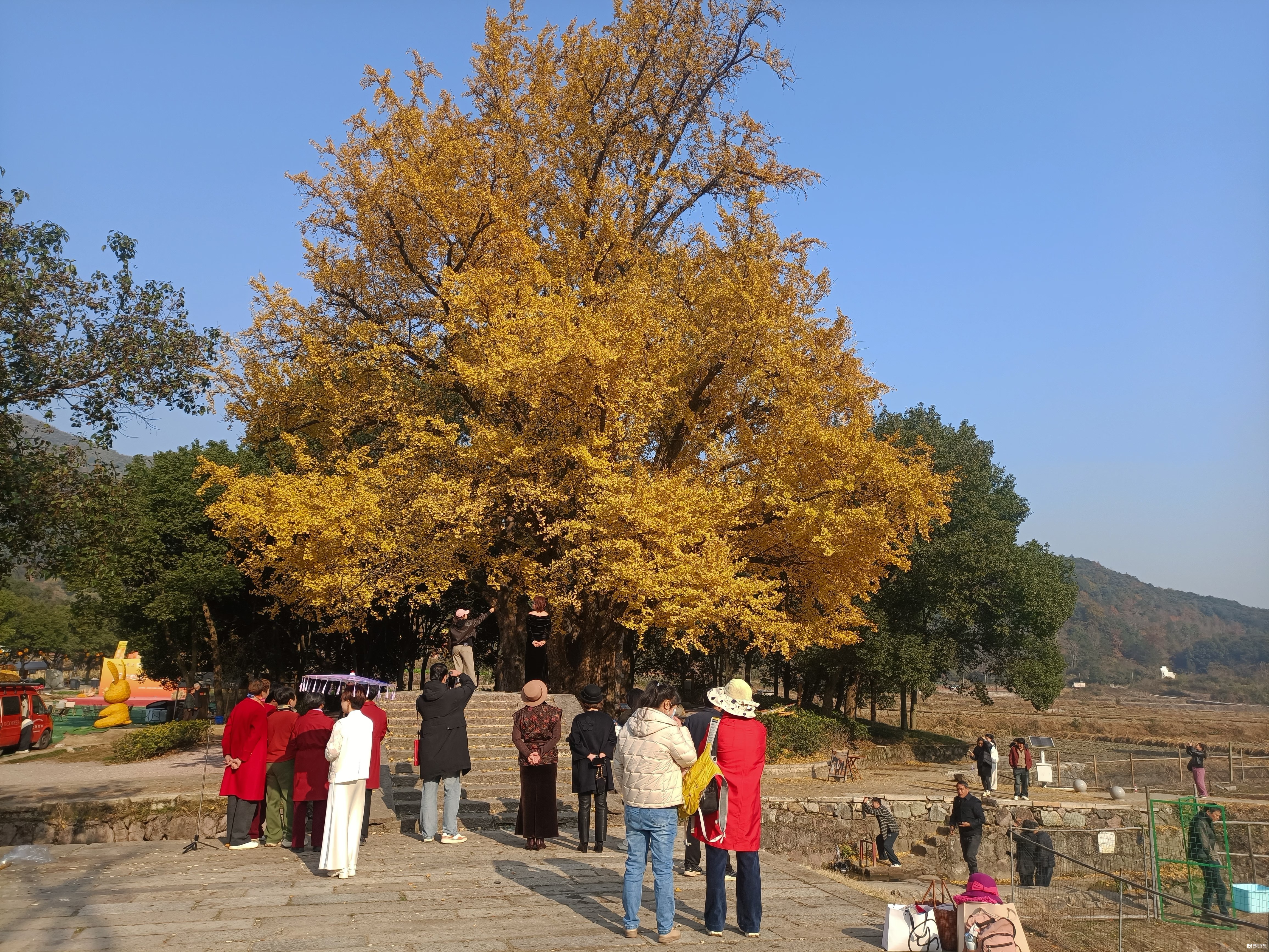 几位珊瑚来迟的男女文友相继赶到,有的颤巍巍地抚摸着粗壮的银杏树皮。那些慕名而来的年轻姑娘妇女们,对着镜头缓缓挥手,一双双美丽的眼睛里盛开了满足;相机手机快门声此起彼伏,没有人高声喧哗,那副愉悦的神情表露在眉眼间、动作里。这般热闹的场景与往昔抗日烽烟血泪形成鲜明的对照,此刻的每一张笑脸,都是对和平生活最真切的诠释。