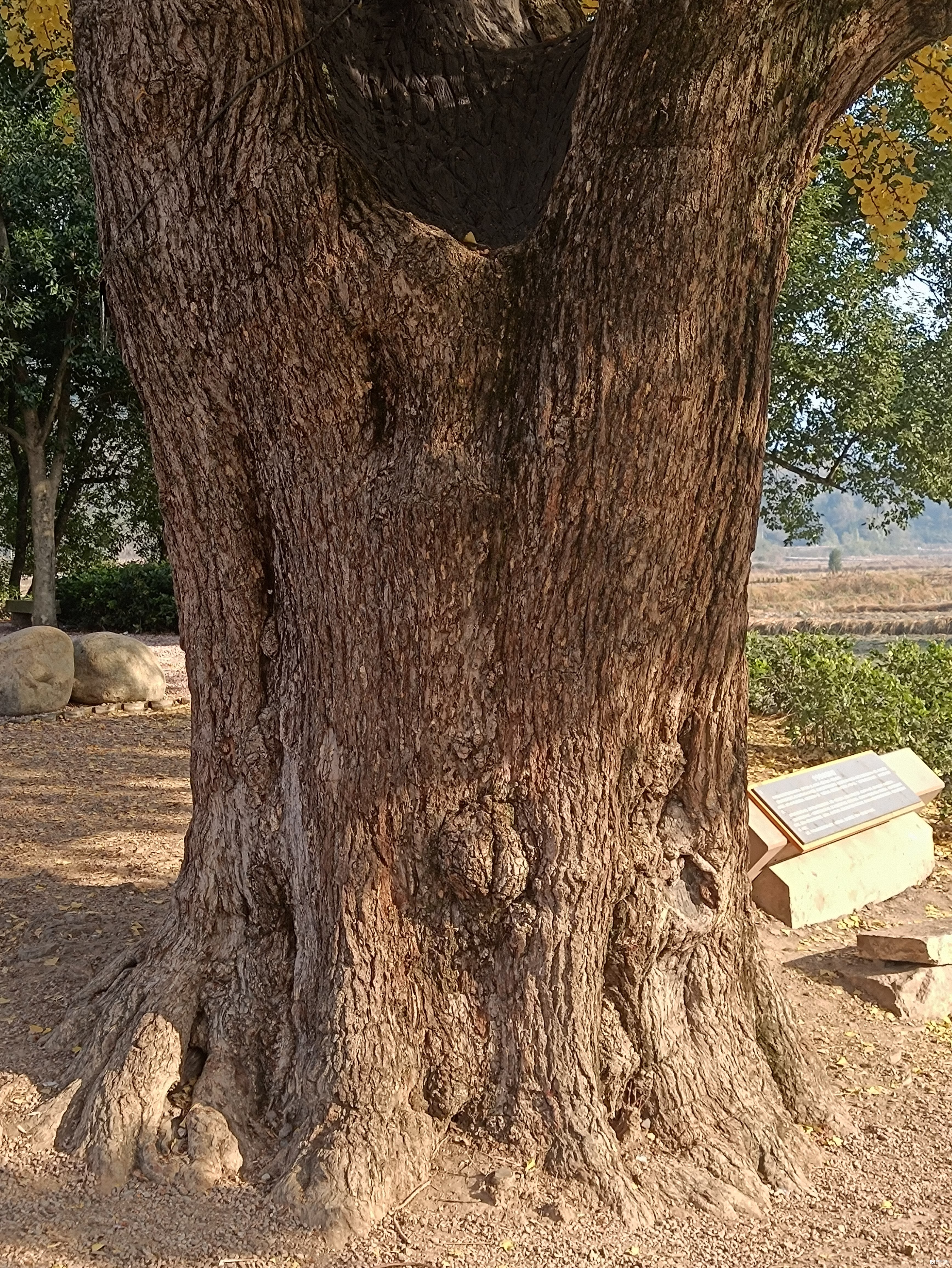 这株古树宛如天地间的坐标,三十余米的身姿直插苍穹,宛如一柄撑开的黄金巨伞,将整片田野都纳入它的庇护范围。抬头望去,枝干虬曲苍劲,如游龙探爪般向四方舒展,老干皴裂的纹路里,刻满了一千二百多年的风霜,却依旧透着磅礴的生命力。树干粗壮得惊人,近一米七八的直径,需要三四个人携手方能环抱,树皮呈深褐,粗糙的纹理纵横交错,像是老人布满皱纹的手掌,触摸上去,能感受到岁月沉淀的厚重与温暖。