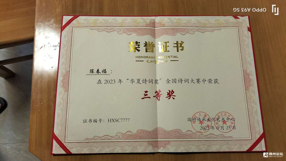 进入陈春福的家,首先映入眼帘的是门玲珑剔透的橱窗,橱窗里摆满了各种各样的收藏品,其中在一个显眼醒目的位置,摆放着一个金色的奖杯,像荣获茅盾文学奖、诺贝尔文学奖那样的金杯一只,金光闪闪,耀眼夺目。旁边张贴着象征着荣誉证书的奖状,赫然印着:陈春福在2023年华夏诗词奖全国诗歌大赛中荣获三等奖!证书编号:hxsc7777。右下方盖着两个鲜红的印章:诗词大赛组委会和国粹传承文化艺术中心。落款日期为2023年6月25日。