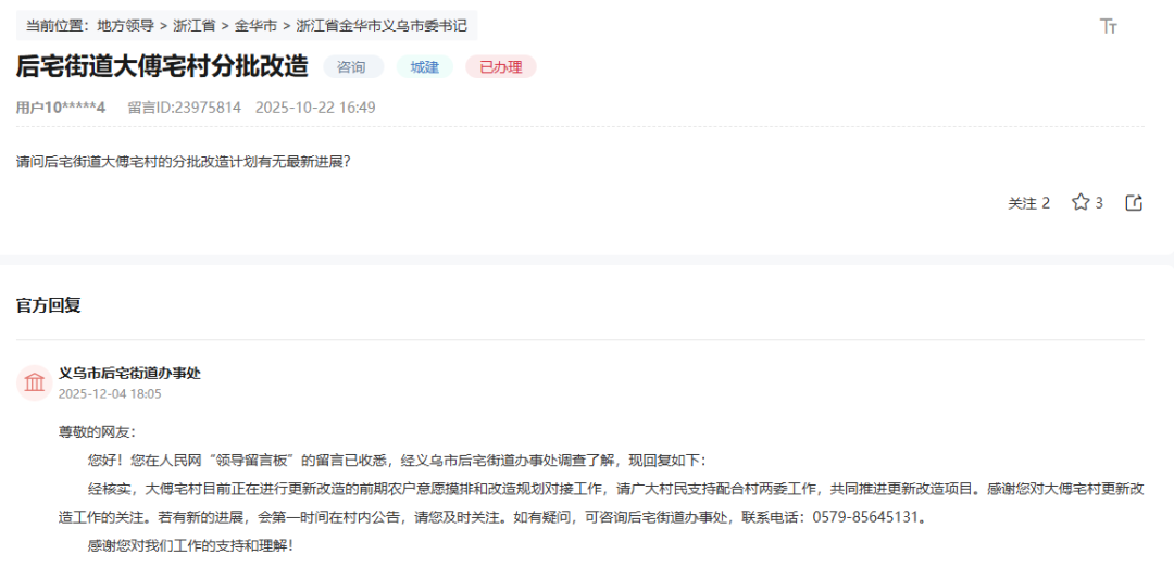 义乌市后宅街道办事处12月4日回复:经核实,大傅宅村目前正在进行更新改造的前期农户意愿摸排和改造规划对接工作,请广大村民支持配合村两委工作,共同推进更新改造项目。感谢您对大傅宅村更新改造工作的关注。若有新的进展,会第一时间在村内公告,请您及时关注。如有疑问,可咨询后宅街道办事处,联系电话:0579-85645131。感谢您对我们工作的支持和理解!