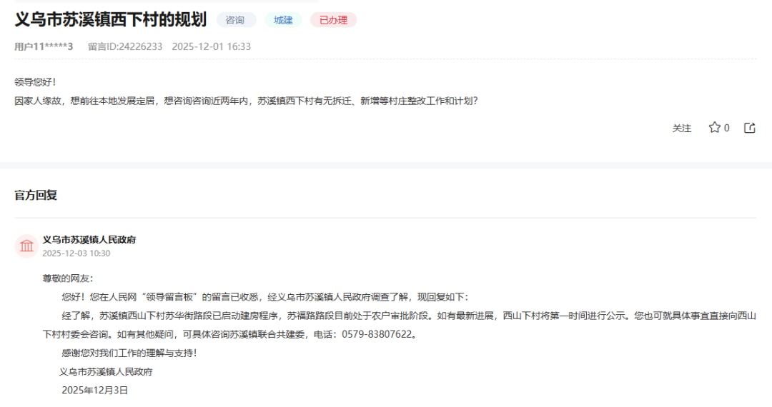 义乌市苏溪镇人民政府12月3日回复:经了解,苏溪镇西山下村苏华街路段已启动建房程序,苏福路路段目前处于农户审批阶段。如有最新进展,西山下村将第一时间进行公示。您也可就具体事宜直接向西山下村村委会咨询。如有其他疑问,可具体咨询苏溪镇联合共建委,电话:0579-83807622。感谢您对我们工作的理解与支持!
