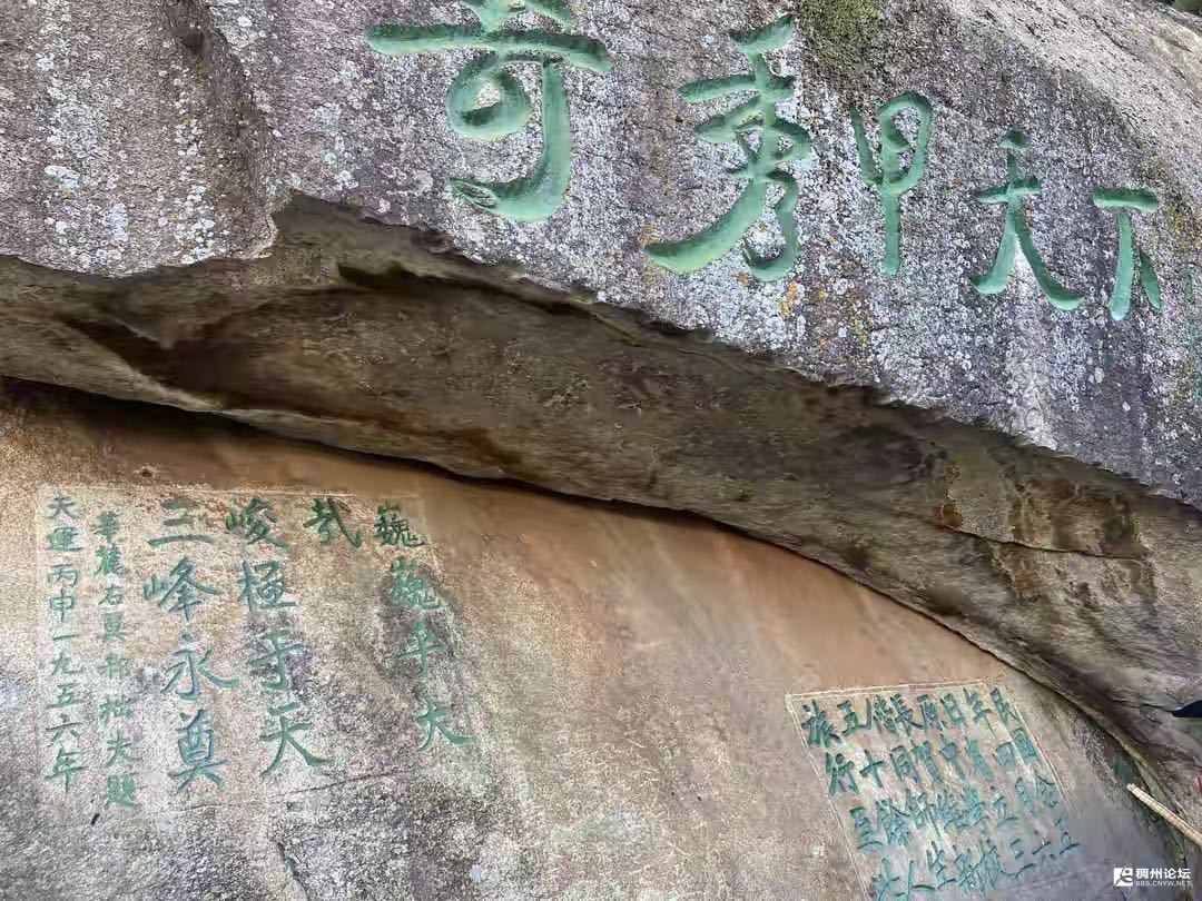 沿途的绝壁上刻有很多摩崖题刻,有清朝的,有民国的,也有解放后的。这些摩崖题刻,字迹清秀,雄浑有力,精彩壮观。久而久之,这些摩崖题刻,自然而然地就形成了一道靚丽的风景线,让游客们生发出了无限的遐想,使高山上的悬崖绝壁有了一些文化气息,有了一种生机勃勃的景象。