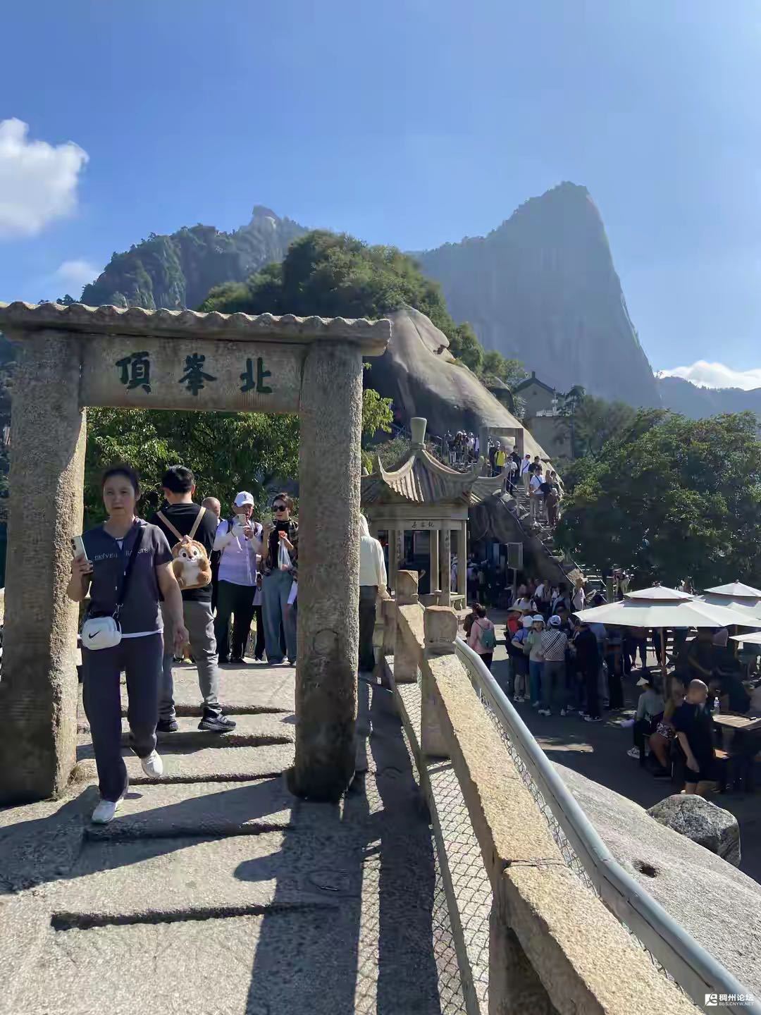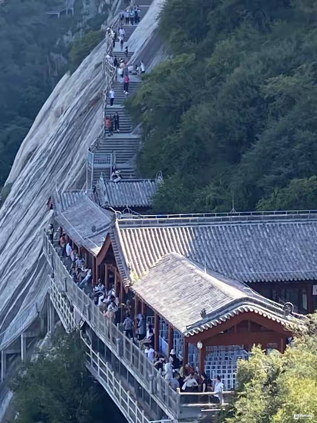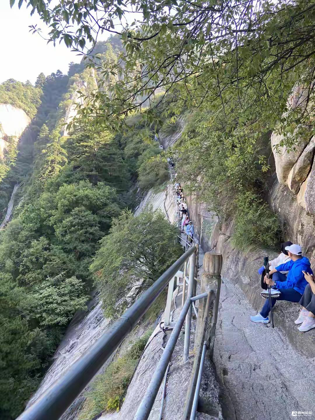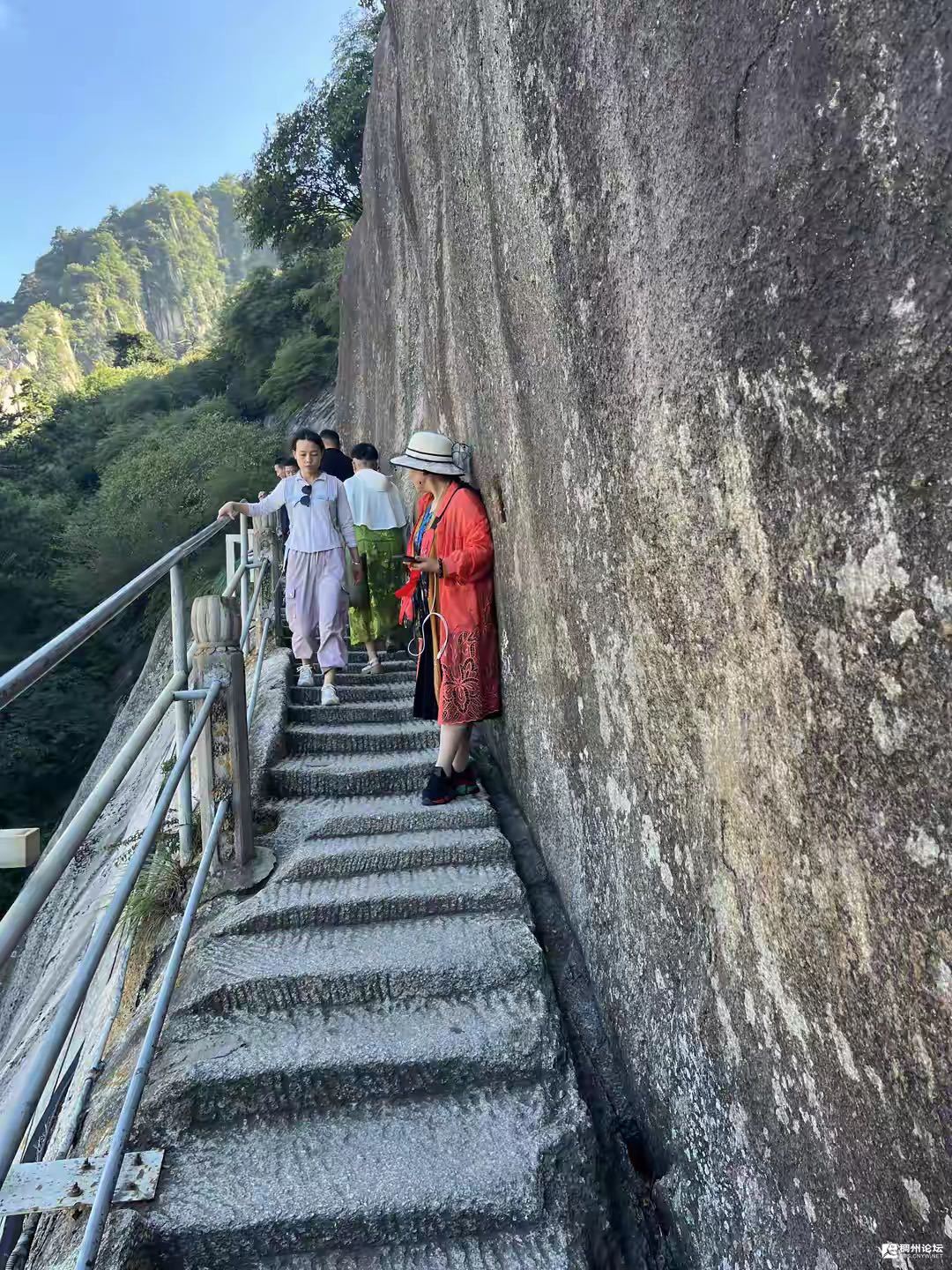 我与小蕾来到了一处较为开阔的地段,此处叫“御道”,相传汉武帝刘彻、唐玄宗李隆基曾由此处登山,故名御道。地方官员为保圣驾安全,在道旁建造石栏,并以帷幔遮护,今道旁所留石臼即其遗迹。刘伯温有诗为证:“石屏御道鸟飞回,汉帝亲封玉简来,游人至此留步,当有吉祥之兆。”此处较为宽敞整洁,可容两人上下走动。长长的御道,石阶层层向上,步步登高,游客走在御道上,仿佛置身在云里雾里。悬崖绝壁,直立云霄,鬼斧神工,雄伟壮丽。
