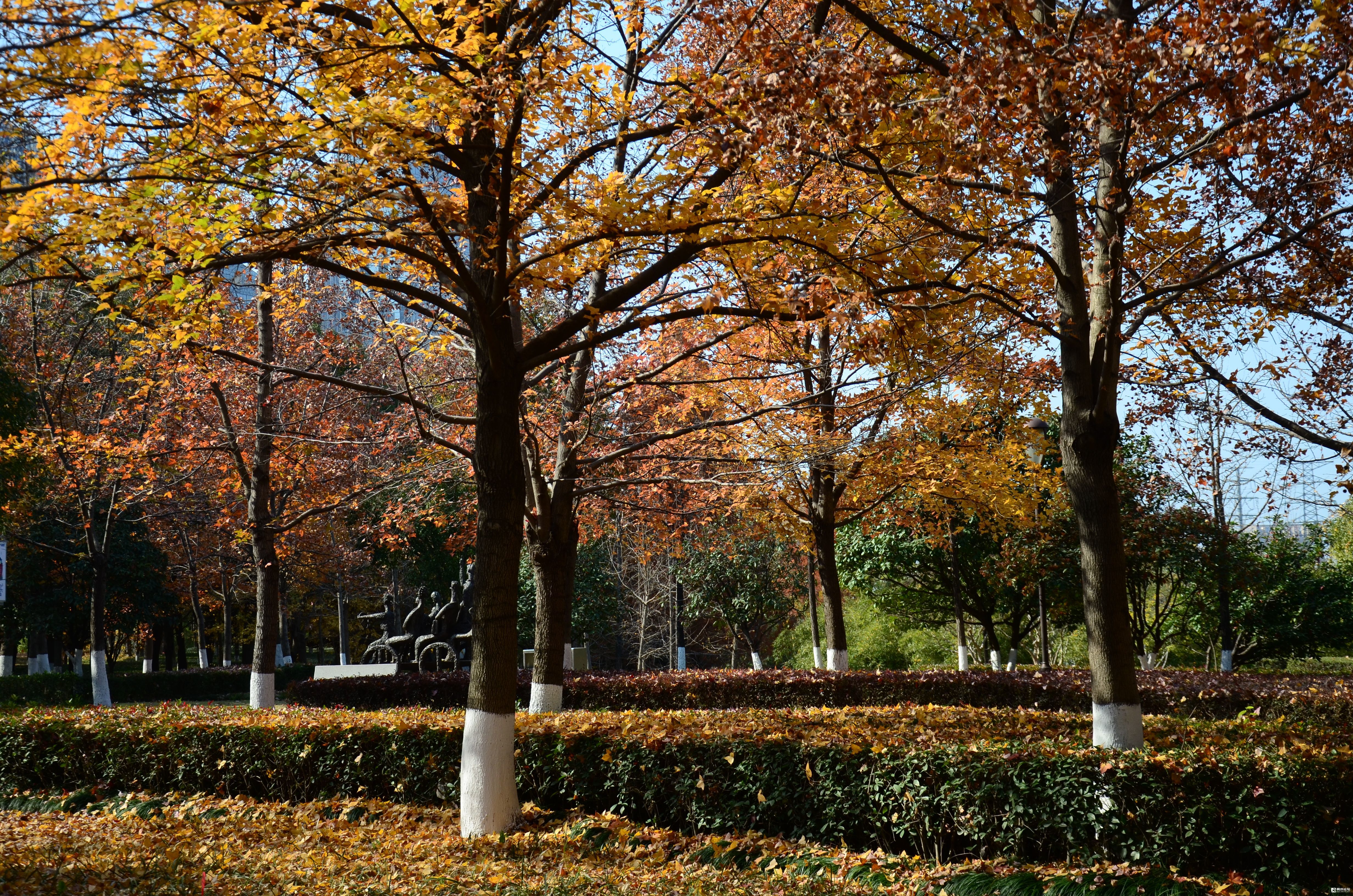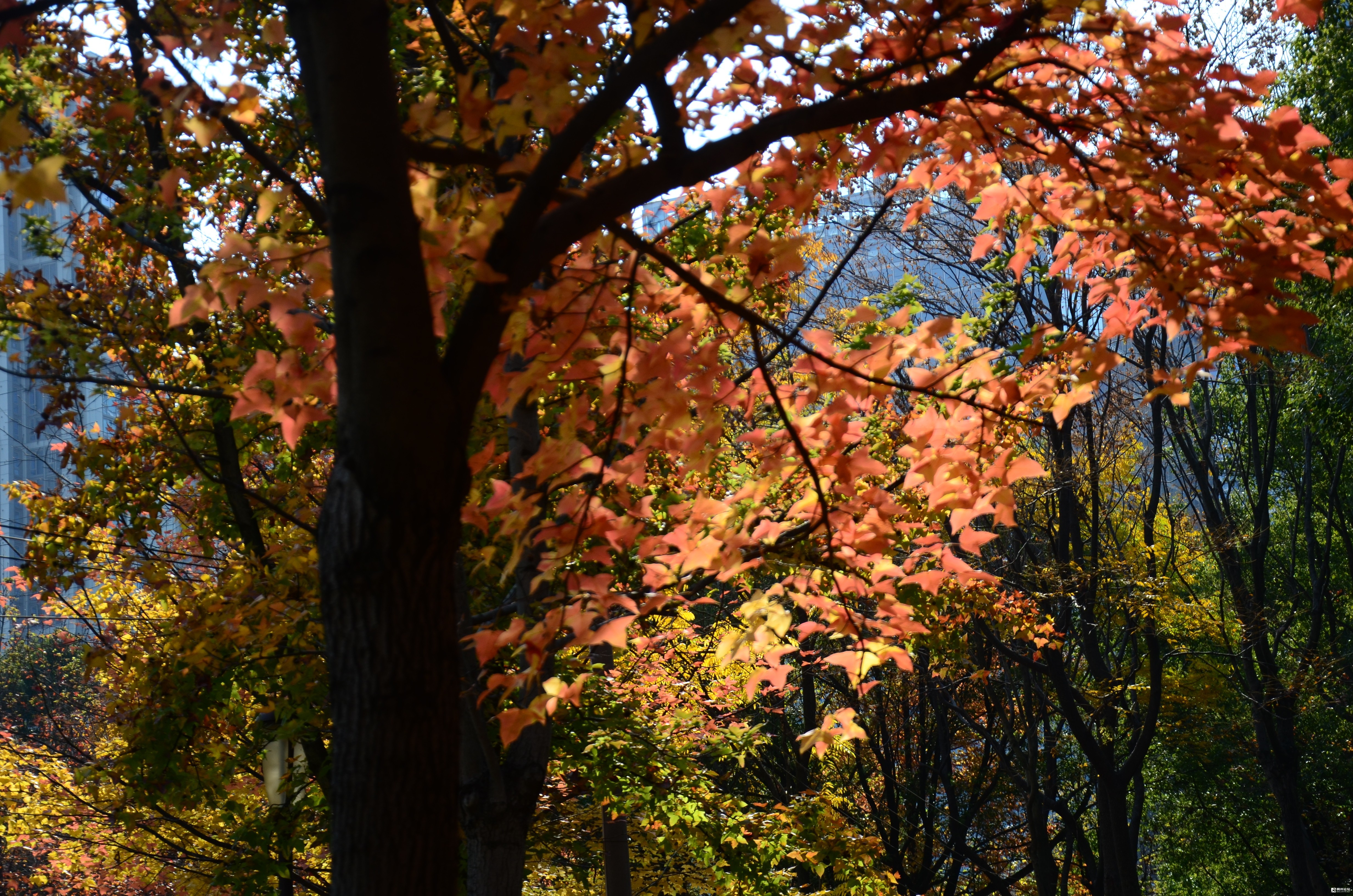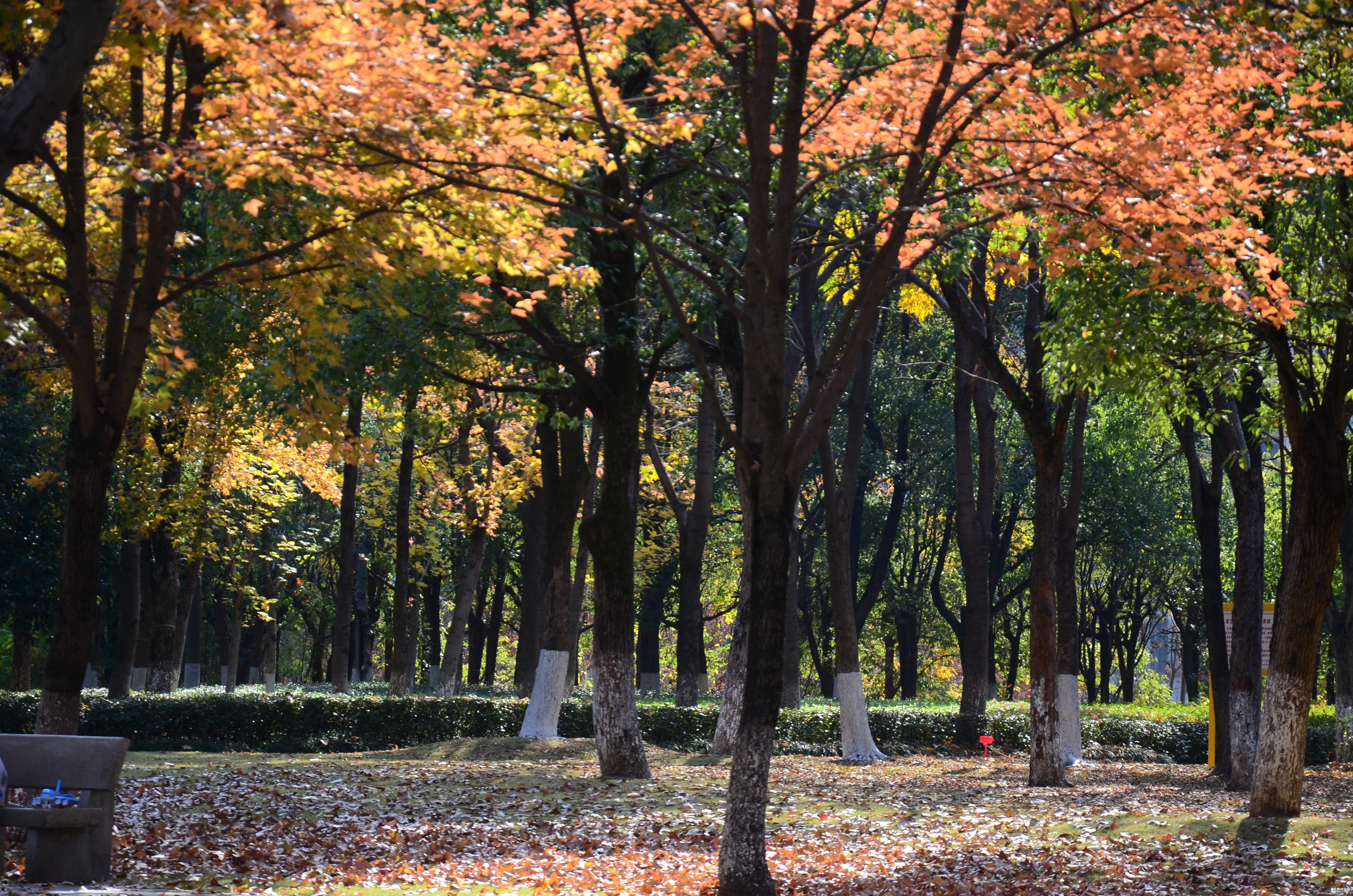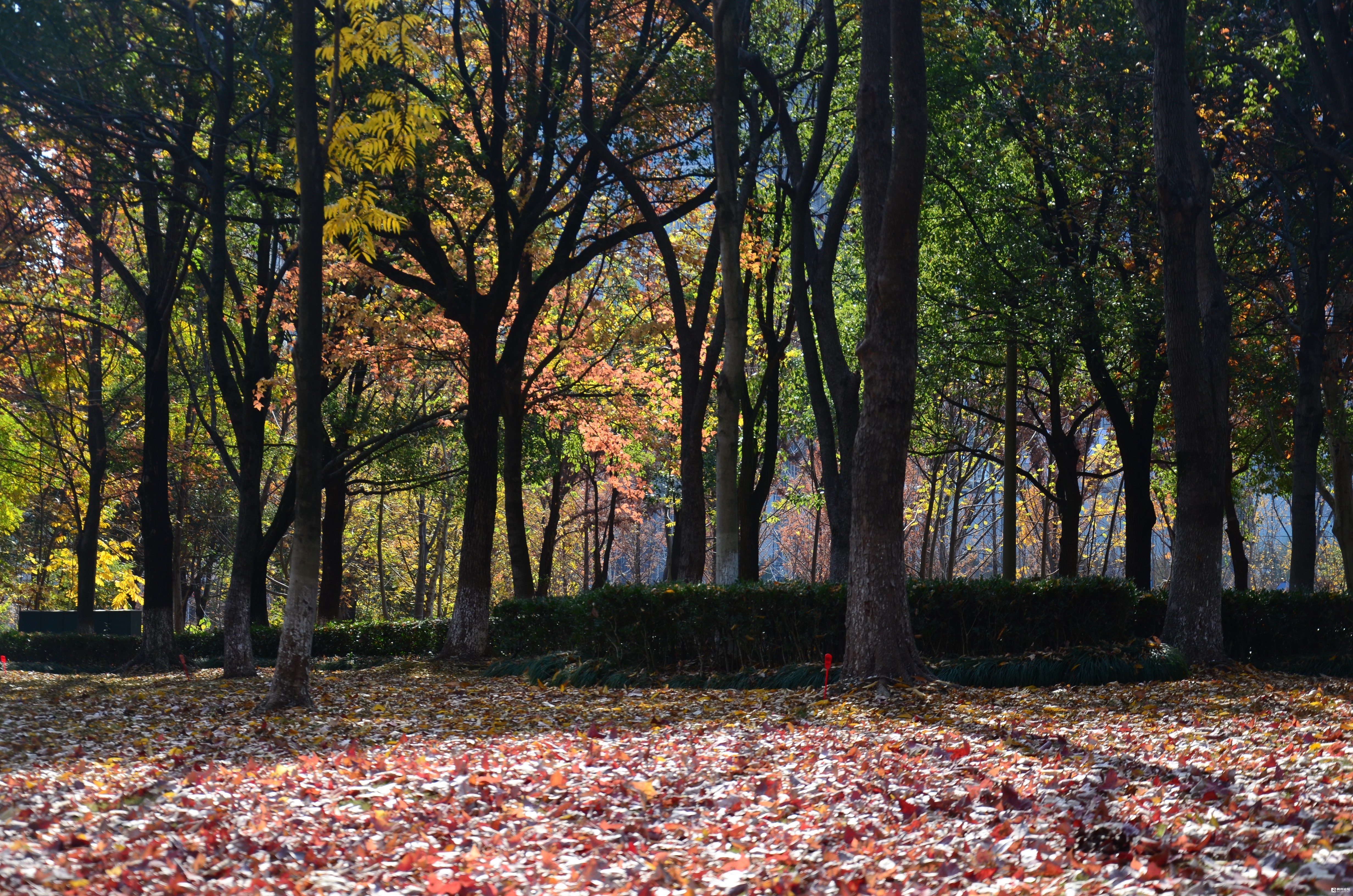 这里是福田公园东南区块,靠近商城大道一侧的那片枫树林,枫叶正红。有微风吹来的时候,枫叶就飘呀飘,飘落在了草地上,已经铺上了厚厚一层。当你轻轻地走过,就会发出沙沙的响声。